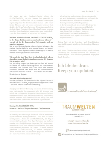 Schaffeldstr. 90-92, 46395 BocholtT. +49 2871 61 42info@t-raumwelten.dewww.t-raumwelten.de @traumwelten.by.elsenbusch @Traumwelten by Elsenbusch - Exklusives Wohnen%u2022 ich%u00a0nehme eine andere, bessere K%u00f6rperspannung bei mir wahr. Insbesondere bei den Partien im Bereich derR%u00fcckenmuskulatur scheinen die maximal vier Trainingseinheiten pro Woche gutzutun. %u2022 in der Tat sp%u00fcre ich, wie sich einzelne Muskelpartienst%u00e4rken / entwickeln / auspr%u00e4gen und%u00a0Muskeln, die jahrelang offensichtlich im Wachkoma lagen %u2022 mein K%u00f6rper f%u00fchlt sich fester %u2026 besser an %u2022 ob ich dadurch an Gewicht verloren habe,kann ich leider nicht sagen %u2013 dazu h%u00e4tte ich mich wiegen m%u00fcssen ;-)Bislang habe ich die Trainings- und Relax-Einheiten ausschlie%u00dflich passiv absolviert, d.h. ohne aktive %u00dcbungen, L%u00e4ufe etc.Nach einem Upgrade mit Christian kann ich ab n%u00e4chstenDonnerstag die Trainings-Intensit%u00e4t um maximal 10 Prozent steigern %u2013 nach wie vor ausgenommen des fragilenBauch-Bereiches.Ich bleibe dran. Keep you updated.t-raumwelten.de/ems-training/F%u00fcr jeden aus der Elsenbusch-Family scheint der%u00a0EASYMOTIONSKIN%u00ae%u00a0 zu einer zweiten Haut geworden zu sein. Allesamt Hardcore-User, die sich gegenseitig ermutigen, regelm%u00e4%u00dfig etwas f%u00fcr ihre Gesundheit zu tun - allen voran Senior Klemens, der mir schon mehrmals versichert hat, dar%u00fcber den Verlauf seiner Parkinson-Erkrankung abzufedern. Auch die Br%u00fcder Christian & Daniel Elsenbusch wissen, wovon sie sprechen. Keine Laufeinheit um den Aasee ohne %u201ezweite Pelle%u201c %u2013 um den Trainingseffekt zu verst%u00e4rken, so Christian.Wie weit muss man fahren, um den EASYMOTIONSKIN%u00aein der Home Edition mieten oder kaufen zu k%u00f6nnen? %u2013 worauf wir in der kommenden PAN-Ausgabe noch zu sprechen kommen.Mir ist kein Mitbewerber im n%u00e4heren Umfeld bekannt %u2013 der n%u00e4chste H%u00e4ndler befindet sich meines Wissens im Bereich Dortmund. Dieses Segment tun sich die wenigsten an, weil es ein sehr beratungsintensives Business ist. Wie regelt ihr das? Das l%u00e4sst sich kaufm%u00e4nnisch schwer darstellen, wenn ihr bei jedem Interessenten 2-3 Stunden Zeit investiert, oder?Das ist richtig. Angesichts dessen veranstalten wir einmal im Monat ein smartes Beratungs-Event mit interessierten Menschen. Die Termine dazu kann man %u00fcber unseren Newsletter erfahren oder indem man das Kontaktformular auf unserer Webseite ausf%u00fcllt. %u2013 Dann treten wir mit EMSNeugierigen in Kontakt.Wie viele Kunden betreut ihr?Derzeit sind es ca. 50 Menschen in der Region, die wir in ihre%u00a0EASYMOTIONSKIN%u00ae eingepasst und eingewiesen haben %u2013 sei es im Verkauf oder in der Vermietung.Nun folgt der Teil der Beratung, wo es um die Entwicklung eines individuellen Trainingsplans geht. Ich skizziere viele Details, die ich lieber vom sympathisch-kompetenten Christian entgegennehme als einer Bedienungsanleitung. Anschlie%u00dfend erfolgen Anprobe und Einweisung in den Anzug, der mich zun%u00e4chst einmal die n%u00e4chsten drei Monate begleiten wird.Montag | 05. Mai 2025 | 07:47 UhrBalearen | Mallorca | Region Santany%u00ec | Cala LombardsIm Einklang mit der Aussage: Maximales Ma%u00df an Freiheit und selbstbestimmten Trainingseinheiten %u2026 und dass an deinen Lieblingsorten %u2026 hatte der%u00a0 EASYMOTIONSKIN%u00ae den Weg in meinen Koffer gefunden. Acht Tage Workation auf Mallorca standen an %u2013 die H%u00e4lfte davon nebst zwei EMS-Trainingseinheiten hatte ich auf einer sch%u00f6nen Finca absolviert. Jetzt stehe ich mit meinem gemieteten VW Crafter %u2026 in einem ebenfalls gemieteten%u00a0 EASYMOTIONSKIN%u00ae%u00a0 in meiner Lieblingsbucht dieser Balearen-Insel und bilanziere folgendes Zwischenfazit%u00a0%u2013%u00a0nach rund einem Monat EMS-Training: Living & Lifestyle I 53