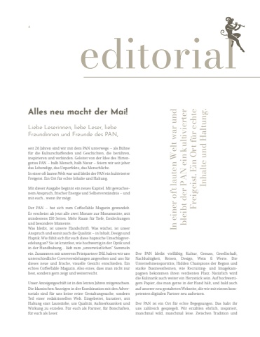 editorialAlles neu macht der Mai!Liebe Leserinnen, liebe Leser, liebe Freundinnen und Freunde des PAN,seit 26 Jahren sind wir mit dem PAN unterwegs %u2013 als B%u00fchne f%u00fcr die Kulturschaffenden und Geschichten, die ber%u00fchren, inspirieren und verbinden. Geleitet von der Idee des Hirtengottes PAN %u2013 halb Mensch, halb Natur %u2013 feiern wir seit jeher das Lebendige, das Unperfekte, das Menschliche.In einer oft lauten Welt war und bleibt der PAN ein kultivierter Freigeist. Ein Ort f%u00fcr echte Inhalte und Haltung.Mit dieser Ausgabe beginnt ein neues Kapitel. Mit gewachsenem Anspruch, frischer Energie und Selbstverst%u00e4ndnis %u2013 und mit euch... wenn ihr m%u00f6gt.Der PAN %u2013 hat sich zum CoffeeTable Magazin gewandelt. Er erscheint ab jetzt alle zwei Monate zur Monatsmitte, mit mindestens 150 Seiten. Mehr Raum f%u00fcr Tiefe, Entdeckungen und besondere Momente.Was bleibt, ist unsere Handschrift. Was w%u00e4chst, ist unser Anspruch und somit auch die Qualit%u00e4t %u2013 in Inhalt, Design und Haptik. Wie f%u00fchlt sich f%u00fcr euch diese haptsiche Umschlagveredelung an? Sie ist kratzfest, wie hochwertig in der Optik und in der Handhabung%u2026 l%u00e4dt zum %u201eunverw%u00fcstlichen%u201c Sammeln ein. Zusammen mit unserem Printpartner D&L haben wir uns unterschiedliche Coververedelungen angesehen und uns f%u00fcr dieses neue und frische, visuelle Gesicht entschieden. Ein echtes CoffeeTable Magazin. Also eines, dass man nicht nur liest, sondern gern zeigt und weiterreicht.Unser Anzeigengesch%u00e4ft ist in den letzten Jahren mitgewachsen. Die klassischen Anzeigen in der Kombination mit den Advertorials sind f%u00fcr uns keine reine Gestaltungssache, sondern Teil einer redaktionellen Welt. Eingebettet, kuratiert, mit Haltung statt Lautst%u00e4rke, um Qualit%u00e4t, Aufmerksamkeit und Wirkung zu erzielen. F%u00fcr euch als Partner, f%u00fcr Botschaften, f%u00fcr euch als Leser.Der PAN bleibt vielf%u00e4ltig: Kultur, Genuss, Gesellschaft, Nachhaltigkeit, Reisen, Design, Wein & Werte. Die Unternehmensportr%u00e4ts, Hidden Champions der Region und starke Businessthemen, wie Recruiting- und Imagekampagnen bekommen ihren verdienten Platz. Nat%u00fcrlich wird die Kulinarik auch weiter ein Herzst%u00fcck sein. Auf hochwertigem Papier, das man gerne in der Hand h%u00e4lt, und bald auch auf unserer neu gestalteten Webseite, die wir mit einem kompetenten digitalen Partner neu aufsetzen.Der PAN ist ein Ort f%u00fcr echte Begegnungen. Das habt ihr uns zahlreich gespiegelt. Wir erz%u00e4hlen ehrlich, inspiriert, manchmal wild, manchmal leise. Zwischen Tradition und In einer oft lauten Welt war und bleibt der PAN ein kultivierter Freigeist. Ein Ort f%u00fcr echte Inhalte und Haltung.4