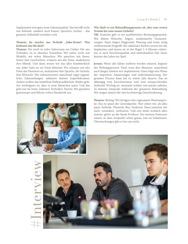 Implantaten eine ganz neue Lebensqualit%u00e4t. Das betrifft nicht nur %u00c4sthetik, sondern auch Kauen, Sprechen, Lachen %u2013 das gesamte Selbstbild ver%u00e4ndert sich.Thomas, du machst aus Technik %u201eZahn-Kunst%u201c. Was bedeutet das f%u00fcr dich?Thomas: F%u00fcr mich ist jeder Zahnersatz ein Unikat. F%u00fcr uns Techniker ist es absolute Feinarbeit. Wir sehen nicht nur Modelle, wir sehen Menschen. Wir sprechen mit ihnen, h%u00f6ren ihre Geschichten, schauen auf alte Fotos, analysieren ihre Mimik. Und dann setzen wir das alles handwerklich um. Jeder Zahn ist ein St%u00fcck Identit%u00e4t. Wir schauen uns alte Fotos der Patienten an, analysieren ihre Sprache, ihr L%u00e4cheln, ihre W%u00fcnsche. Wir rekonstruieren manchmal sogar jugendliche Zahnstellungen, inklusive kleiner Imperfektionen. Andere wollen das makellose Hollywoodl%u00e4cheln. Beides geht. Am wichtigsten ist, dass es zum Menschen passt. Und das geht nur im Team. Zahnarzt, Techniker, Patient. Wir gestalten gemeinsam und f%u00fchren echtes Handwerk aus.Wie l%u00e4uft so ein Behandlungsprozess ab, also vom ersten Termin bis zum neuen L%u00e4cheln?Till: Zun%u00e4chst gibt es ein ausf%u00fchrliches Beratungsgespr%u00e4ch. Wir kl%u00e4ren W%u00fcnsche, %u00c4ngste, medizinische Voraussetzungen. Dann folgen Diagnostik, Planung und wenn n%u00f6tig vorbereitende Eingriffe. Bei zahnlosen Kiefern setzen wir die Implantate und lassen sie in der Regel 3%u20136 Monate einheilen, je nach Knochenqualit%u00e4t und individuellem Fall. Dann kommt das Labor ins Spiel.Jeroen: Wenn alle Z%u00e4hne entfernt werden m%u00fcssen, beginnt der Heilungsprozess. Nach etwa drei Monaten, manchmal auch l%u00e4nger, k%u00f6nnen wir implantieren. Dann folgt eine Phaseder Anproben, Anpassungen und Individualisierung. Der gesamte Prozess kann bis zu einem Jahr dauern. Das ist abh%u00e4ngig vom Knochenstatus und vom entsprechenden Aufwand. Wichtig ist, niemand verl%u00e4sst uns jemals zahnlos. Zu keinem Zeitpunkt w%u00e4hrend der gesamten Behandlung. Wir sorgen immer f%u00fcr eine hochwertige Zwischenl%u00f6sung.Thomas: Richtig. Wir fertigen eine sogenannte Wachsanprobe. Das ist quasi die Generalprobe. Hier sehen wir, ob alles passt. %u00c4sthetik, Phonetik, Biss, Funktion. Dann justieren wir nach, ver%u00e4ndern, verfeinern. Und erst wenn wirklich alles stimmt, geht%u2019s an die finale Prothese. Die meisten Patienten wissen zu dem Zeitpunkt schon genau, was sie bekommen. %u00dcberraschungen gibt es bei uns nicht.#InterviewLiving & Lifestyle I 59