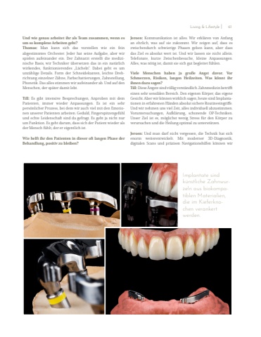 Und wie genau arbeitet ihr als Team zusammen, wenn es um so komplexe Arbeiten geht?Thomas: Man kann sich das vorstellen wie ein fein abgestimmtes Orchester. Jeder hat seine Aufgabe, aber wir spielen aufeinander ein. Der Zahnarzt erstellt die medizinische Basis, wir Techniker %u00fcbersetzen das in ein nat%u00fcrlich wirkendes, funktionierendes %u201eL%u00e4cheln%u201c. Dabei geht es um unz%u00e4hlige Details. Form der Schneidekanten, leichte Drehrichtung einzelner Z%u00e4hne, Farbschattierungen, Zahnstellung, Phonetik. Das alles stimmen wir aufeinander ab. Und auf den Menschen, der sp%u00e4ter damit lebt.Till: Es gibt intensive Besprechungen, Anproben mit dem Patienten, immer wieder Anpassungen. Es ist ein sehr pers%u00f6nlicher Prozess, bei dem wir auch viel mit den Emotionen unserer Patienten arbeiten. Geduld, Fingerspitzengef%u00fchl und echte Leidenschaft sind da gefragt. Es geht ja nicht nur um Funktion. Es geht darum, dass sich der Patient wieder als der Mensch f%u00fchlt, der er eigentlich ist.Wie helft ihr den Patienten in dieser oft langen Phase der Behandlung, positiv zu bleiben?Jeroen: Kommunikation ist alles. Wir erkl%u00e4ren von Anfang an ehrlich, was auf sie zukommt. Wir zeigen auf, dass es zwischendurch schwierige Phasen geben kann, aber dass das Ziel es absolut wert ist. Und wir lassen sie nicht allein. Telefonate, kurze Zwischenbesuche, kleine Anpassungen. Alles, was n%u00f6tig ist, damit sie sich gut begleitet f%u00fchlen.Viele Menschen haben ja gro%u00dfe Angst davor. VorSchmerzen, Risiken, langen Heilzeiten. Was k%u00f6nnt ihrihnen dazu sagen?Till: Diese %u00c4ngste sind v%u00f6llig verst%u00e4ndlich. Zahnmedizin betrifft einen sehr sensiblen Bereich. Den eigenen K%u00f6rper, das eigene Gesicht. Aber wir k%u00f6nnen wirklich sagen, heute sind Implantationen in erfahrenen H%u00e4nden absolut sichere Routineeingriffe. Und wir nehmen uns viel Zeit, alles individuell abzustimmen. Voruntersuchungen, Aufkl%u00e4rung, schonende OP-Techniken. Unser Ziel ist es, m%u00f6glichst wenig Stress f%u00fcr den K%u00f6rper zu verursachen und die Heilung optimal zu unterst%u00fctzen.Jeroen: Und man darf nicht vergessen, die Technik hat sich enorm weiterentwickelt. Mit moderner 3D-Diagnostik, digitalen Scans und pr%u00e4zisen Navigationshilfen k%u00f6nnen wir Implantate sind k%u00fcnstliche Zahnwurzeln aus biokompatiblen Materialien, die im Kieferknochen verankertwerden.Living & Lifestyle 61 I