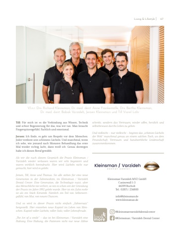 Kleinsman Varzideh MVZ GmbHCasinowall 1-346399 BocholtTel.: 02871 / 236800info@kleinsman.dewww.kleinsman.de @kleinsmanvarzidehdentalcenter @Kleinsman / Varzideh Dental Center Till: F%u00fcr mich ist es die Verbindung aus Wissen, Technik und echter Begeisterung f%u00fcr das, was wir tun. Man braucht Fingerspitzengef%u00fchl. Fachlich und emotional.Jeroen: Ich finde, es geht um Respekt vor dem Menschen. Jeder verdient sein sch%u00f6nstes L%u00e4cheln. Und manchmal, wenn ich sehe, wie jemand nach Monaten Behandlung das erste Mal wieder richtig lacht, dann wei%u00df ich: Genau deswegen habe ich diesen Beruf gew%u00e4hlt.Als wir die nach diesem Gespr%u00e4ch die Praxis Kleinsman / Varzideh wieder verlassen waren wir echt begeistert undwaren wirklich beeindruckt. Hier wird L%u00e4cheln nicht nur gemacht, hier wird es gelebt.Jeroen, Till, Anne und Thomas. Sie alle stehen f%u00fcr eine neue Generation in der Zahnmedizin, im Kleinsman / Varzideh Dental Center. Eine Generation, die Technologie nutzt, aber das Menschliche nie verliert, so wie es schon seit der Gr%u00fcndung der Praxis im Jahre 1992 gelebt wurde. Hier ist ein Zahn mehr ist als ein St%u00fcck Keramik. N%u00e4mlich ein Teil von Selbstwertgef%u00fchl, von Mut, von neuen Chancen.Und so wird in dieser Praxis nicht einfach %u201eZahnersatz%u201c hergestellt. Hier entstehen neue Kapitel im Leben von Menschen. Kapitel voller L%u00e4cheln, voller Stolz, voller Lebensfreude.%u201eThe Art of a smile%u201c %u2013 das ist bei Kleinsman / Varzideh eine Haltung. Eine Haltung, die Patienten nicht nur neue Z%u00e4hne schenkt, sondern das Vertrauen, wieder offen, herzlich und selbstbewusst durchs Leben zu gehen.Und vielleicht %u2013 nur vielleicht %u2013 beginnt das %u201esch%u00f6nste L%u00e4cheln der Welt%u201c manchmal genau an einem solchen Tisch, an dem Freundschaft, Vertrauen und handwerkliche Leidenschaft zusammenkommen.V.l.n.r: Drs. Richard Kleinsman, Dr. med. dent. Anne Frankem%u00f6lle, Drs. Bertho Kleinsman, Dr. med. dent. Babak Varzideh, Jeroen Kleinsman und Till Viorel L%u00f6hrLiving & Lifestyle I 67