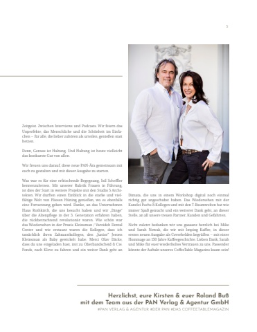 Zeitgeist. Zwischen Interviews und Podcasts. Wir feiern das Unperfekte, das Menschliche und die Sch%u00f6nheit im Einfachen %u2013 f%u00fcr alle, die lieber zuh%u00f6ren als urteilen, genie%u00dfen statt hetzen.Denn, Genuss ist Haltung. Und Haltung ist heute vielleicht das kostbarste Gut von allen.Wir freuen uns darauf, diese neue PAN-%u00c4ra gemeinsam mit euch zu gestalten und mit dieser Ausgabe zu starten.Was war es f%u00fcr eine erfrischende Begegnung, Isil Scheffler kennenzulernen. Mit unserer Rubrik Frauen in F%u00fchrung, ist dies der Start in weitere Projekte mit den Studio S Architekten. Wir durften einen Einblick in die starke und vielf%u00e4ltige Welt von Fliesen H%u00fcning genie%u00dfen, wo es ebenfalls eine Fortsetzung geben wird. Danke, an das Unternehmen Haus Rothkirch, die uns besucht haben und wir %u201eDinge%u201c %u00fcber die Altenpflege in der 3. Generation erfahren haben,die r%u00fcckbetrachtend revolution%u00e4r waren. Wie sch%u00f6n war das Wiedersehen in der Praxis Kleinsman / Varzideh Dental Center und wie erstaunt waren die Kollegen, dass ich tats%u00e4chlich ihren Zahnarztkollegen, den %u201eJunior%u201c Jeroen Kleinsman als Baby gewickelt habe. Merci Olav D%u00e4cke, dass du uns eingeladen hast, mit zu Oberbandscheid & Cie. Fonds, nach Kleve zu fahren und ein weiter Dank geht an Dimata, die uns in einem Workshop digital noch einmal richtig gut angeschubst haben. Das Wiedersehen mit der Kanzlei Fuchs & Kollegen und mit den T-Raumwelten hat wie immer Spa%u00df gemacht und ein weiterer Dank geht, an dieser Stelle, an all unsere treuen Partner, Kunden und Gef%u00e4hrten.Nicht zuletzt bedanken wir uns gaaaanz herzlich bei Mike und Sarah Nowak, die wir mit Imping Kaffee, in dieser ersten neuen Ausgabe als Coverhelden begr%u00fc%u00dfen %u2013 mit einer Hommage an 150 Jahre Kaffeegeschichte. Lieben Dank, Sarah und Mike f%u00fcr euer wiederholtes Vertrauen zu uns. Passender k%u00f6nnte der Auftakt unseres CoffeeTable Magazins kaum sein! Herzlichst, eure Kirsten & euer Roland Bu%u00df mit dem Team aus der PAN Verlag & Agentur GmbH#PAN VERLAG & AGENTUR #DER PAN #DAS COFFEETABLEMAGAZIN5