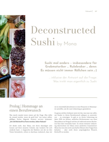 Prolog | Hommage aneinen Berufswunsch%u00a0Was macht man(n) wenn einem auf die Frage %u201eWas willst du einmal werden, wenn du gro%u00df bist%u201c von seiner s%u00fc%u00dfen, pfiffigen Nichte folgende Antwort serviert bekommt: %u201eIch will K%u00f6cherIN in Paris werden, lieber Roland.%u201cIch denke nicht, dass Mona, mit ihren damaligen acht Lenzen auf ihrer smarten Schulter, das Gendern f%u00fcr sich entdeckt hatte ;-). Angesichts der Klarheit, mit der sie ihre Vision formulierte, schien es durchaus realistisch, dass wir DeconstructedSushi by Mona%u00a0sie in eineinhalb Jahrzehnten in einer Brasserie in Montmartre antreffen, um ihr zum Geburtstag zu gratulieren.%u00a0Zu genau solchen Anl%u00e4ssen taten wir das, was man tun sollte,um Kinder in ihrem Berufswunsch ad%u00e4quat zu unterst%u00fctzen %u2026 zu ermutigen. So gab es zu ihrem Geburtstag im Jahre 2018 ein kleines, amtliches K%u00fcchenmesser aus einer Manufaktur im P%u00e9rigod, welches ich w%u00e4hrend meiner BucketList-Tour dort erstanden hatte. Zu einem weiteren Geburtstag %u00fcberreichten wir Mona einen amtlichen Granitm%u00f6rser. Mona hat trotz des nicht unscharfen Messers ihre Fingerchen behalten %u2013 aber nicht ihren urspr%u00fcnglichen Wunsch, K%u00f6cherIN zu werden. Sushi mal anders %u2013 insbesondere f%u00fcr Grobmotoriker %u2026 Rulebraker %u2026 denn: Es m%u00fcssen nicht immer R%u00f6llchen sein ;-)%u2026 inklusive der Antwort auf die Frage: Was trinkt man eigentlich zu SushiKulinarik I 69