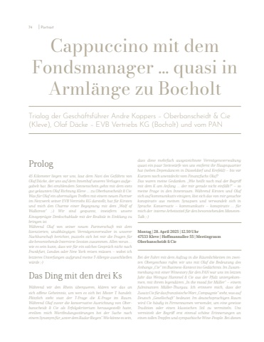 Cappuccino mit dem Fondsmanager %u2026 quasi in Arml%u00e4nge zu BocholtProlog45 Kilometer liegen vor uns, laut dem Navi des Gef%u00e4hrts von Olaf D%u00e4cke, der uns auf dem Innenhof unseres Verlages aufgegabelt hat. Bei strahlendem Sonnenschein gehts mit dem stets gut gelaunten Olaf Richtung Kleve %u2026 zu Oberbanscheidt & Cie. Was f%u00fcr Olaf ein abermaliges Treffen mit einem neuen Partner im Netzwerk seiner EVB Vertriebs KG darstellt, hat f%u00fcr Kirstenund mich den Charme einer Begegnung mit dem %u201eWolf ofWallstreet%u201c ;-) Wir sind gespannt, inwiefern unsere Kinogepr%u00e4gte Denkschublade mit der Realit%u00e4t in Einklang zu bringen ist. W%u00e4hrend Olaf von seiner neuen Partnerschaft mit dem lizenzierten, unabh%u00e4ngigen Verm%u00f6gensverwalter in unserer Nachbarschaft berichtet, puzzeln sich bei mir die Fragen f%u00fcr die bevorstehende Interview-Session zusammen. Allen voran %u2026 wie es sein kann, dass wir f%u00fcr ein solches Gespr%u00e4ch nicht nach Frankfurt, London oder New York reisen m%u00fcssen %u2013 wobei ich letzteres Unterfangen aufgrund meine T-Allergie ausschlie%u00dfen w%u00fcrde ;-) Das Ding mit den drei Ks W%u00e4hrend wir den Rhein %u00fcberqueren, kl%u00e4ren wir das an sich offene Geheimnis, um wen es sich bei Mister T. handelt. Pl%u00f6tzlich steht statt der T-Frage die K-Frage im Raum. W%u00e4hrend Olaf zuvor die konservative Ausrichtung von Oberbanscheidt & Cie als Erfolgskriterium herausgestellt hatte, ereilten mich Wortfindungsst%u00f6rungen bei der Suche nach einem Synonym f%u00fcr %u201eunter dem Radar fliegen%u201c. Wie k%u00f6nne es sein, Trialog der Gesch%u00e4ftsf%u00fchrer Andre Koppers %u2013 Oberbanscheidt & Cie (Kleve), Olaf D%u00e4cke %u2013%u00a0EVB Vertriebs KG (Bocholt) und vom PANdass diese mehrfach ausgezeichnete Verm%u00f6gensverwaltung quasi ein paar Steinw%u00fcrfe von uns entfernt ihr Hauptquartier hat (neben Dependancen in D%u00fcsseldorf und Krefeld) %u2013 bis vor Kurzem noch unentdeckt vom Finanzfuchs Olaf? Das waren meine Gedanken. %u201eWie hei%u00dft noch mal der Begriff mit dem K am Anfang %u2026 der mir gerade nicht einf%u00e4llt?%u201c %u2013 so meine Frage in den Innenraum. W%u00e4hrend Kirsten und Olaf sich auf kommunikativ einigten, l%u00f6st sich das von mir gesuchte konspirativ aus meinen Synapsen und verwandelt sich in Sprache. Konservativ %u2013 kommunikativ %u2013 konspirativ %u2026 f%u00fcr mich der interne Arbeitstitel f%u00fcr den bevorstehenden MonetenTalk ;-) Montag | 28. April 2025 | 12.50 Uhr 47533 Kleve | Hoffmannallee 55 | MeetingraumOberbanscheidt & CieBei der Fahrt mit dem Aufzug in die R%u00e4umlichkeiten im zweiten Obergeschoss rufen wir uns mit Olaf die Bedeutung des Anhangs %u201eCie%u201c im Business-Kontext ins Ged%u00e4chtnis. Im Zusammenhang mit einer Winestory f%u00fcr den PAN war uns im letzten Jahr das Weingut Hammel & Cie aus der Pfalz untergekommen, mit ihrem legend%u00e4ren %u201eIn the mood for M%u00fcller%u201c %u2013 einem fulminanten M%u00fcller-Thurgau. Ich erinnere mich, dass der Zusatz Cie f%u00fcr das franz%u00f6sische Wort %u201eCompagnie%u201c steht, was auf Deutsch %u201eGesellschaft%u201c bedeutet. Im deutschsprachigen Raum wird Cie h%u00e4ufig in Firmennamen verwendet, um eine gewisse Tradition oder einen klassischen Stil zu vermitteln. Uns vermittelt der Begriff erst einmal sch%u00f6ne Erinnerungen an einen tollen Tropfen und sympathische Wine-People. Bei diesen 74 I Portrait