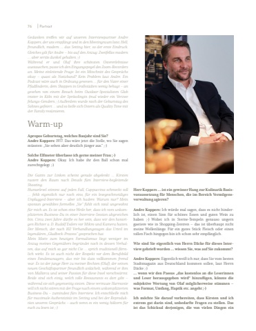 Gedanken treffen wir auf unseren Interviewpartner Andre Koppers, der uns empf%u00e4ngt und in den Meetingraum lotst. Hell, freundlich, modern %u2026 das Setting hier, so der erste Eindruck. Gleiches gilt f%u00fcr Andre %u2013 bis auf den Anzug: Zweifellos modern %u2026 aber seri%u00f6s dunkel gehalten ;-)W%u00e4hrend er und Olaf ihre sch%u00f6nsten Ostererlebnisse austauschen, passe ich den Eingangspegel des Zoom-Recorders an. Meine einleitende Frage: Ist ein Mitschnitt des Gespr%u00e4chs okay %u2013 quasi als Notizband? Kein Problem laut Andre. Ein Podcast w%u00e4re auch in Ordnung gewesen %u2026 f%u00fcr den Vater einer Pfadfinderin, dem Shoppen in Gro%u00dfst%u00e4dten wenig behagt %u2013 an gesehen von einem Besuch beim Outdoor-Spezialisten Glob trotter in K%u00f6ln mit der Spr%u00f6sslingin (mal wieder ein Verzwe felungs-Gendern ;-) Au%u00dferdem wurde noch der Geburtstag des Sohnes gefeiert %u2026 und so lie%u00dfe sich Ostern als Quality Time mit der Family res%u00fcmieren. Warm-up Apropos Geburtstag, welches Baujahr sind Sie? Andre Koppers: 1977. Das w%u00e4re jetzt die Stelle, wo Sie sagen m%u00fcssten: %u201eSie sehen aber deutlich j%u00fcnger aus.%u201c ;-)Solche Elfmeter %u00fcberlasse ich gerne meiner Frau ;-) Andre Koppers: Okay. Ich habe ihr den Ball schon mal zurechtgelegt ;-)Die Gattin zur Linken scheint gerade abgelenkt %u2026 Kirsten rastert den Raum nach Details f%u00fcrs Interview-begleitende Shooting. Humorlevel stimmt auf jeden Fall, Cappuccino schmeckt toll %u2026 fehlt eigentlich nur noch eins, f%u00fcr ein lesegeschmeidiges Unplugged-Interview %u2013 aber ich hadere. Warum nur? Mein spontan gew%u00e4hltes formelles %u201eSie%u201c f%u00fchlt sich total ungewohnt f%u00fcr mich an. Es ist schon eine Weile her, dass ich vom unkomplizierten Business-Du in einer Interview-Session abgewichen bin. Circa zwei Jahre d%u00fcrfte es her sein, dass wir den honorigen Richter a. D. Rudolf Esders vor Mikro und Kamera hatten. Der Mensch, der nach 102 Verhandlungstagen das Urteil im legend%u00e4ren %u201eGladbeck-Prozess%u201c gesprochen hat. Mein Motiv zum heutigen Formalismus liegt weniger im Anzug meines Gegen%u00fcbers begr%u00fcndet noch in dessen Verhalten, das auf mich so gar nicht Cie %u2026 sprich traditionell-f%u00f6rmlich wirkt. Es ist auch nicht der Respekt vor dem Berufsbild eines Fondsmanagers, das mir bis dato vollkommen fremd war. Es ist der junge Herr zu meiner Rechten (Olaf), der seinen neuen Gesch%u00e4ftspartner freundlich anl%u00e4chelt, w%u00e4hrend er ihm von Mallorca und seiner Passion f%u00fcr diese Insel vorschw%u00e4rmt. Beide sind sich einig, welch tolle Restaurants es dort gibt %u2013 w%u00e4hrend sie sich gegenseitig siezen. Diese vertraute Harmonie will ich nicht st%u00f6ren mit der Frage nach einem unkomplizierten Business-Du %u2013 zumindest f%u00fcrs Interview. Ich entschlie%u00dfe mich f%u00fcr maximale Authentizit%u00e4t im Setting und bei der Reproduktion unseres Gespr%u00e4chs %u2013 auch wenn es ein wenig h%u00f6lzern f%u00fcr euch zu lesen ist ;-) Herr Koppers %u2026 ist ein gewisser Hang zur Kulinarik Basisvoraussetzung f%u00fcr Menschen, die im Bereich Verm%u00f6gensverwaltung agieren? Andre Koppers: Ich w%u00fcrde mal sagen, dass es nicht hinderlich ist, einen Sinn f%u00fcr sch%u00f6nes Essen und guten Wein zu haben ;-) Wobei ich in Sterne-Tempeln genauso ungern gastiere wie in Shopping-Zentren %u2013 das ist %u00fcberhaupt nicht meine Wellenl%u00e4nge. F%u00fcr ein gutes St%u00fcck Fleisch oder einen tollen Fisch hingegen bin ich schon sehr empf%u00e4nglich. Wie sind Sie eigentlich von Herrn D%u00e4cke f%u00fcr dieses Interview gebrieft worden %u2026 wissen Sie, was auf Sie zukommt? Andre Koppers: Eigentlich wei%u00df ich nur, dass Sie vom besten Stadtmagazin aus Deutschland kommen sollen, laut Herrn D%u00e4cke ;-) %u2026 wenn wir den Passus %u201edas kostenlos an die Leserinnen und Leser herausgegeben wird%u201c hinzuf%u00fcgen, k%u00f6nnte die subjektive Wertung von Olaf m%u00f6glicherweise stimmen %u2013 was Format, Umfang, Haptik etc. angeht ;-) Ich m%u00f6chte Sie darauf vorbereiten, dass Kirsten und ich extrem gut darin sind, unbedarfte Fragen zu stellen. Das ist das Schicksal derjenigen, die von vielen Dingen ein 76 I Portrait
