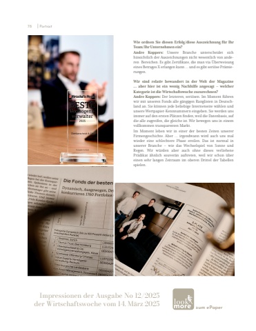 Wie ordnen Sie diesen Erfolg/diese Auszeichnung f%u00fcr Ihr Team/Ihr Unternehmen ein? Andre Koppers: Unsere Branche unterscheidet sich hinsichtlich der Auszeichnungen nicht wesentlich von anderen Bereichen. Es gibt Zertifikate, die man via %u00dcberweisung eines Betrages X erlangen kann %u2026 und es gibt seri%u00f6se Pr%u00e4mierungen. Wir sind relativ bewandert in der Welt der Magazine %u2026 aber hier ist ein wenig Nachhilfe angesagt %u2013 welcher Kategorie ist die Wirtschaftswoche zuzurechnen? Andre Koppers: Der letzteren, seri%u00f6sen. Im Moment f%u00fchren wir mit unseren Fonds alle g%u00e4ngigen Ranglisten in Deutschland an. Sie k%u00f6nnen jede beliebige Internetseite w%u00e4hlen und unsere Wertpapier-Kennnummern eingeben. Sie werden uns immer auf den ersten Pl%u00e4tzen finden, weil die Datenbasis, auf die alle zugreifen, die gleiche ist. Wir bewegen uns in einem vollkommen transparenten Markt.Im Moment leben wir in einer der besten Zeiten unserer Firmengeschichte. Aber %u2026 irgendwann wird auch uns mal wieder eine schlechtere Phase ereilen. Das ist normal in unserer Branche %u2013 wie das Wechselspiel von Sonne und Regen. Wir w%u00fcrden aber auch ohne dieses verliehene Pr%u00e4dikat %u00e4hnlich souver%u00e4n auftreten, weil wir schon %u00fcber einen sehr langen Zeitraum im oberen Drittel der Tabellen spielen. Impressionen der Ausgabe No 12/2025 der Wirtschaftswoche vom 14. M%u00e4rz 2025 zum ePaper78 I Portrait