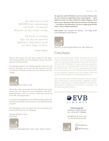 Bitcoin. Hier liegen wir sehr sehr moderat in der Mitte. Sehr interessant f%u00fcr etwas vorsichtigere Anleger, die einen l%u00e4ngeren Horizont haben.Die Digitalstrategien von Oberbanscheidt findest Du auf unserer Homepage www.evb-vv.de. Hier k%u00f6nnen wir sechs verschiedene Strategien anbieten ab einer Summe von Euro 25.000,-.www.evb-vv.deDie beiden oben genannten Investmentfonds kann jeder Kunde %u00fcber sein Depot bei seiner Hausbank, einer Wertpapierplattform oder in unserem Fondsshop bereits ab Euro 500,- einmalig kaufen. %u00a0In all diesen Anlageformen von Oberbanscheidt findet sich die DNA und die Idee des Investierens von Oberbanscheidt wieder!!!F%u00fcr R%u00fcckfragen stehe ich Euch und den Leserinnen und Lesern jederzeit gerne zur Verf%u00fcgung.Mit freundlichen Gr%u00fc%u00dfen,Olaf D%u00e4ckeAktives Management, das man sehen kann. Du sprachst auf der Hinfahrt auch von einem Podcast, den du seit neuestem eingerichtet hast und bespielst %u2013 unter anderem auch von einer Staffel mit Andre Koppers. Auch wenn unser Moneten-Talk durchaus Podcast-w%u00fcrdig w%u00e4re %u2026 wo k%u00f6nnen die Menschen, die jetzt neugierig geworden sind, in diese Staffel reinh%u00f6ren?Olaf D%u00e4cke: Zum Beispiel bei Spotify %u2013 die Folge hei%u00dft: Achterbahnfahrt an den B%u00f6rsen. Spotify: Achterbahnfahrt an den B%u00f6rsen. ConclusioBei der Niederschrift dieser Zeilen durchlaufe ich noch mal unseren Gespr%u00e4chsverlauf und das, was ich wahrgenommen habe. Das hatte so gar nichts gemein mit meinem Schubladenbild vom Wolf of Wallstreet. Es w%u00e4re auch zu kurz gesprungen, das Team von Oberbanscheidt & Cie als die %u201eF%u00fcchse von der Hoffmannallee%u201c (dem Sitz ihres Headquarters) zu labeln. Drum w%u00fcrde ich gerne mit einem Relaunch der K-Frage enden. Zu den gew%u00e4hrten Einblicken und dem Gespr%u00e4ch fallen mir spontan K-Eigenschaften zu Oberbanscheidt & Cie ein: Klug | Kompetent | Klar | Kraftvoll | Kultiviert | Kreativ | Kooperativ | Kontinuierlich | Kundenorientiert | Kalkuliert | Kosteneffizient | Und die schon erw%u00e4hnten Begriffe wie konservativ | Kommunikativ | Konspirativ | Als Letztes: K- wie kr%u00e4ftig %u2013 wie der bevorzugte Rotwein Rioja ;-) EVB Vertriebs KGNordwall 6, 46399 BocholtTel.: +49 (0) 2871 / 2188496info@evb-finance.dewww.evb-finance.de @evbfinance @EVB Finance %u2026 f%u00fcr mich privat sind 200.000 Euro wahnsinnig viel Geld ... in unserer Branche ist das relativ wenig. Ich finde es wichtig, dass ich das bei unseren t%u00e4glichen Aktivit%u00e4ten nicht aus dem Auge verliere.Andre KoppersPortrait I 87