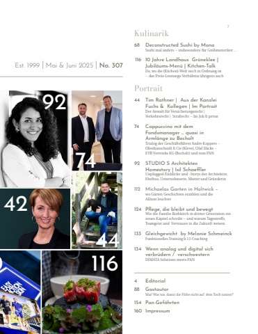 Est. 1999 I Mai & Juni 2025 I No. 3074 Editorial88 GastautorMai! Was tun, damit die Fl%u00f6he nicht auf dem Tisch tanzen?154 Pan-Gef%u00e4hrten160 ImpressumKulinarik68 Deconstructed Sushi%u00a0by Mona%u00a0 Sushi mal anders %u2013 insbesondere f%u00fcr Grobmotoriker %u2026 116 10 Jahre Landhaus Gr%u00fcneklee |%u0009 Jubil%u00e4ums-Men%u00fc%u00a0| Kitchen-Talk%u00a0 Da,%u00a0wo die (K%u00fcchen)-Welt noch in Ordnung ist%u2013%u00a0das Preis-Leistungs-Verh%u00e4ltnis%u00a0%u00fcbrigens auch Portrait44 Tim Rathner | Aus der KanzleiFuchs & Kollegen | Im PortraitDer Anwalt f%u00fcr Versicherungsrecht | Verkehrsrecht | Strafrecht %u2013 Im Job & privat 74 Cappuccino mit dem Fondsmanager %u2026 quasi inArml%u00e4nge zu Bocholt Trialog der Gesch%u00e4ftsf%u00fchrer Andre Koppers %u2013 Oberbanscheidt & Cie (Kleve), Olaf D%u00e4cke %u2013%u00a0 EVB Vertriebs KG (Bocholt) und vom PAN92 STUDIO S Architekten %u0009 Homestory | Isil Schaeffler Unplugged-Einblicke und -Storys der Architektin, Ehefrau, Unternehmerin, Mutter und Gr%u00fcnderin112 Michaelas Garten in Holtwick %u2013 wo G%u00e4rten Geschichten erz%u00e4hlen und die Allium leuchtet124%u0009 %u0009Pflege, die bleibt und bewegt Wie die Familie Rothkirch in dritter Generation ein neues Kapitel schreibt %u2013 und warum Tagestreffs, Teamgeist und Vertrauen in die Zukunft weisen.133 Gleichgewicht by Melanie Schmeinck Funktionelles Training & 1:1-Coaching134 Wenn analog und digital sich verbr%u00fcdern / verschwestern DIMATA Solutions meets PAN 921166874440427