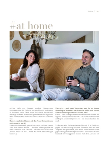 m%u00f6chte, nicht nur Geb%u00e4ude, sondern Lebensr%u00e4ume. Daraus entstand der Gedanke bzw. der Wunsch, Architekturzu studieren. Meine Eltern haben mich darin best%u00e4rkt und ermutigt. Sie waren immer sehr open minded, was angesichts ihrer Wurzeln/ihrer Herkunft damals eher die Ausnahme war. Hast du ergr%u00fcnden k%u00f6nnen, wie das Feuer f%u00fcr Architektur in dir entfacht wurde?Ich war immer ziemlich gut in Mathe %u2013 aber auch sehr kreativ. Aber nicht kreativ kreativ %u2026 sondern immer gepaart mit einer Sehnsucht nach Struktur %u2013 ich habe einen echt hohen %u201eStrucki-Anteil%u201c in mir %u2026 wenn du damit etwas anfangen kannst? ;-)Kann ich %u2026 auch mein Wortschatz, den du um diesen neuen Begriff bereichert hast, kann das ;-) Also nicht kreativ kreativ, sondern gestalterisch kreativ, oder? Genau %u2026 und deswegen war mein Berufsziel Architektin die logische Konsequenz meiner DNA. Da st%u00f6%u00dft die Kreativit%u00e4t auf Regeln, Gesetzm%u00e4%u00dfigkeiten etc. %u2013 ein ideales Spielfeld f%u00fcr mich. Ich bin ein sehr freiheitsliebender Mensch, d. h. Unabh%u00e4ngigkeit ist sehr wichtig f%u00fcr mich. Seinerzeit hielt ich den Zeitpunkt f%u00fcr gekommen, das traute Heim meiner Elterngegen eine eigene Wohnung zu tauschen %u2013 auch wenn ich dazu finanziell ein wenig pokern musste. Nach dem Abi hatte ich #at homePortrait I 95