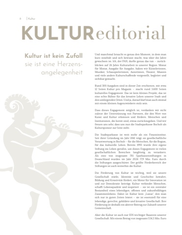 KULTUReditorialKultur ist kein Zufallsie ist eine Herzensangelegenheit Und manchmal braucht es genau den Moment, in dem man kurz inneh%u00e4lt und sich bewusst macht, was %u00fcber die Jahre gewachsen ist. Ich, der PAN, durfte genau das tun %u2013 zur%u00fcckblicken auf 26 Jahre Kulturarbeit in unserer Region. Monat f%u00fcr Monat, Ausgabe f%u00fcr Ausgabe, haben wir K%u00fcnstlerinnen, Musiker, Schauspielerinnen, Autorinnen, Theater, Museen und viele andere Kulturschaffende vorgestellt, begleitet und sichtbar gemacht.Rund 300 Ausgaben sind in dieser Zeit erschienen, mit etwa 12 Seiten Kultur pro Magazin %u2013 macht rund 3.600 Seiten kulturelles Engagement. Das ist kein kleines Projekt, das ist eine echte B%u00fchne f%u00fcr das kreative Leben unserer Stadt und den umliegenden Orten. Und ja, darauf darf man auch einmal mit einem kleinen Augenzwinkern stolz sein.Dass dieses Engagement m%u00f6glich ist, verdanken wir nicht zuletzt der Unterst%u00fctzung von Partnern, die den Wert von Kunst und Kultur erkennen und f%u00f6rdern. Menschen und Institutionen, die bereit sind, etwas zur%u00fcckzugeben. Und wir freuen uns sehr, dass uns nun die Stadtsparkasse Bocholt als Kultursponsor zur Seite steht.Die Stadtsparkasse ist weit mehr als ein Finanzinstitut. Seit ihrer Gr%u00fcndung im Jahr 1841 tr%u00e4gt sie gesellschaftliche Verantwortung in Bocholt %u2013 f%u00fcr die Menschen, f%u00fcr die Region,f%u00fcr das kulturelle Leben. Bereits 1993 wurde ihre eigene Stiftung ins Leben gerufen, um dieses Engagement in vielengesellschaftlichen Bereichen langfristig zu verankern. Als eine von insgesamt 781 Sparkassenstiftungen in Deutschland wurden im Jahr 2024 77,9 Mio. Euro durchdie Stiftungen ausgesch%u00fcttet. Der gr%u00f6%u00dfte F%u00f6rderbereich der Stiftungen ist auch weiterhin die Kultur.Die F%u00f6rderung von Kultur ist wichtig, weil sie unsere Gesellschaft st%u00e4rkt, Identit%u00e4t und Geschichte bewahrt, Bildung und Kreativit%u00e4t f%u00f6rdert, ein Motor f%u00fcr Innovation ist und zur Demokratie beitr%u00e4gt. Kultur verbindet Menschen,schafft Lebensqualit%u00e4t und inspiriert %u2013 sie ist ein zentraler Bestandteil eines lebendigen, offenen und zukunftsf%u00e4higen Zusammenlebens. Dabei ist Kultur kein %u201eLuxus%u201c, den man sich nur in guten Zeiten leistet %u2013 sie ist essenziell f%u00fcr eine lebendige, gerechte, gebildete und kreative Gesellschaft. Ihre F%u00f6rderung ist deshalb ein aktiver Beitrag zur Zukunft unserer Gemeinschaft.Aber die Kultur ist auch nur EIN wichtiger Baustein unserer Gesellschaft. Mit einem Betrag von insgesamt 534,5 Mio. Euro 8 I Kultur