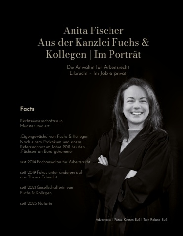 Anita FischerAus der Kanzlei Fuchs & Kollegen | Im Portr%u00e4tDie Anw%u00e4ltin f%u00fcr ArbeitsrechtErbrecht %u2013 Im Job & privatFactsRechtswissenschaften in M%u00fcnster studiert%u201eEigengew%u00e4chs%u201c von Fuchs & Kollegen Nach einem Praktikum und einem Referendariat im Jahre 2011 bei den %u201eF%u00fcchsen%u201c an Bord gekommen seit 2014 Fachanw%u00e4ltin f%u00fcr Arbeitsrecht seit 2019 Fokus unter anderem aufdas Thema Erbrecht seit 2021 Gesellschafterin von Fuchs & Kollegenseit 2025 NotarinAdvertorial I Fotos: Kirsten Bu%u00df I Text: Roland Bu%u00df
