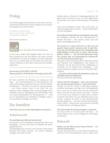 PrologIn der M%u00e4rzausgabe des PAN haben wir die Story zum Generationswechsel der Kanzlei Fuchs & Kollegen mit euch geteilt. Die komplette Story mit dem Titel: Von F%u00fcchsen und ihrem Bau Vom %u201ezweiten Sturm%u201c auf dem Eis Von Dackeln und Pferdenk%u00f6nnt ihr hier nachlesen: pan-bocholt.de/fuchskollegenIn den letzten beiden PAN-Ausgaben haben wir euch mit Alina Quinkenstein und Tim Rathner die beiden anderen Gesellschafter von Fuchs & Kollegen im Portr%u00e4t vorgestellt. Ziel ist es, ein Gef%u00fchl daf%u00fcr zu entwickeln, wie diese juristischen Charaktere in ihrer Robe und jenseits der Amtskleidung ticken.Donnerstag | 26. Juni 2025 | 13.00 Uhr M%u00fcnsterstra%u00dfe 12 | 46397 Bocholt | Meetingraum des PANIhr kennt sicherlich die Wendung %u201eit%u2019s raining cats and dogs%u201c %u2013 eine Umschreibung f%u00fcr ein XXL-Schietwetter. Ein solches holte Fellnase Paula und mich um 12.55 Uhr wolkenbruchartig ein %u2013 173,5 Meter vor unserer rettenden Haust%u00fcr%u2013 nach einem leichten Lunch in der Stadt. Wie zwei begossene Pudel empfingen Paula und ich die Regenschirmbewaffnete Anita im Meetingraum des PAN-Verlages. Nach ein wenig Trockenplaudern (vs. Warmquatschen ;-) %u2026 rund um ein Spezialthema der k%u00fcnstlichen Intelligenz, ging esmit menschlicher Intelligenz ins Thema: Die Anw%u00e4ltinLiebe Anita, lass uns in deine Spezialgebiete eintauchen %u2026ArbeitsrechtWas sind klassische F%u00e4lle des Arbeitsrechts? Der Klassiker und am h%u00e4ufigsten vorkommende Fall ist die K%u00fcndigung %u2013 in erster Linie, wenn ein Mandant die K%u00fcndigung erhalten hat. Auf Arbeitgeberseite, die wir ja auch vertreten, w%u00fcrde dieserklassische Fall fr%u00fcher eintreten: %u201eIch m%u00f6chte jemandem k%u00fcndigen. Wie mache ich das?%u201cDaneben geht es oftmals um Verg%u00fctungsanspr%u00fcche, bei denen man sich uneins ist, wie z. B. nicht abgerechnete %u00dcberstunden, eine saubere Aufrechnung der Urlaubstage etc. Viele meiner Mandanten ziehen mich auch zurate, um Arbeitsvertr%u00e4ge pr%u00fcfen zu lassen %u2013 sowohl Arbeitnehmer als auch Arbeitgeber. Bei welchen Gerichten bist du vornehmlich unterwegs? Am h%u00e4ufigsten sicherlich bei den Arbeitsgerichten in Bocholt und Wesel %u2013 diese decken jeweils einen sehr gro%u00dfen Zust%u00e4ndigkeitsbereich ab. Der Vorteil an so einem Interview ist, dass man auf gezielte Fragen gezielt antworten darf. Es gibt Menschen, die tun sich damit schwer, ihre Schokoladenseite eigenst%u00e4ndig ins rechte Licht zu setzen. Falls du dazu geh%u00f6ren solltest ;-) %u2013 hier die br%u00fcckenbauende Frage: Was zeichnet dich, als Fachanw%u00e4ltin f%u00fcr Arbeitsrecht, aus? Was kannst du besonders gut?Ich glaube, ich bin ziemlich gut darin, Menschen sachlichund realistisch ihre M%u00f6glichkeiten und Chancen zu vermitteln. Ich bin kein Freund davon, Hoffnungen zu vermitteln, die der Realit%u00e4t nicht standhalten %u2026 bzw. etwas in Aussicht zu stellen, wovon ich nicht absolut %u00fcberzeugt bin. %u2026 also nicht nach dem Mund der Mandanten reden, mit dem Blick auf deren Geldbeutel?Das halte ich f%u00fcr sehr unanst%u00e4ndig. Auf der Seite der Arbeitgeber %u2013 gibt es dort Unternehmen, die du permanent betreust %u2013 quasi als Flatrate? Die gibt es in der Tat. Gerade in Unternehmen geh%u00f6ren rechtliche Beratungen zum Tages- bzw. Wochengesch%u00e4ft. Das ist auch gut so, Themen rund um das Arbeitsrecht kosten nicht nur viel Zeit, sondern auch Geld %u2013 da kann es von Vorteil sein, Fachleute an seiner Seite zu wissen. Es kommt nicht selten vor, dass Arbeitgeber sich an uns wenden, nachdem das Kind in den sprichw%u00f6rtlichen Brunnen gefallen ist %u2013 weil man zun%u00e4chst die Beratungskosten scheute. %u00a0Oftmals kann eine pr%u00e4ventive Beratung vor hohen Kosten im Nachgang sch%u00fctzen.Wie viele Anw%u00e4lte f%u00fcr Arbeitsrecht gibt es in Bocholt?Ich schaue nicht so viel nach rechts und links %u2026 ich w%u00fcrde sch%u00e4tzen, dass es 10-15 Kolleginnen und Kollegen sein k%u00f6nnten. ErbrechtRichten wir den Blick auf das Thema Erbrecht %u2013 was sind dort die Klassiker? Ein ganz klassischer Fall ist, wenn jemand verstorben ist und man sich als Hinterbliebener nicht zu helfen wei%u00df. Portrait I 99
