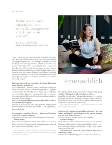 Oder %u2026 es ist jemand verstorben und man wei%u00df bzw. stellt fest, dass man enterbt wurde. Wenn das mit dem eigenen Gerechtigkeitsgef%u00fchl nicht in Einklang zu bringen ist %u2013%u00a0steht die Frage nach dem gesetzlichen Pflichtteil im Raum. Da wissen viele Menschen verst%u00e4ndlicherweise nicht, was die n%u00e4chsten Schritte sind, die gegangen werden m%u00fcssen. Zudem kommt es nicht selten vor, dass die Erben sich untereinander zerstritten haben. Das sind zum Teil sehr emotional besetzte Sachverhalte. Da steht nicht immer nur das Geld im Vordergrund, das geht es um verletzte Gef%u00fchle, um fehlende Wertsch%u00e4tzung etc. Das kann man sich gut vorstellen. Ist deine Rolle dann mehr die einer Mediatorin? Nicht unmittelbar %u2026 denn ich vertrete jeweils nur eine Partei. De facto ist es so, dass ich viele der Kolleginnen und Kollegen auf dem Gebiet des Erbrechts kenne. Das macht es einfacher, einvernehmliche L%u00f6sungen zu entwickeln, die es erm%u00f6glichen, dass sich die Menschen hinterher noch bzw. wieder in die Augen schauen k%u00f6nnen.Was zu Lebzeiten des Erblassers nicht geklappt hat, scheint nach seinem Tod m%u00f6glich? Vielfach ist das der Fall, dass eine gerechte Regelung den Familienfrieden wiederherstellen kann %u2026 die Ungerechtigkeit ein Ende hat. Vorausgesetzt, man h%u00e4tte das vor %u2026 kann man Menschen tats%u00e4chlich komplett enterben?Es gibt eine Variante, die das Gesetz ausdr%u00fccklich vorsieht %u2026 %u2026 und die w%u00e4re? Wenn der Pflichtteilberechtigte dem Erblasser nach dem Leben trachtet. Da dies schwierig nachzuweisen ist, habe ich sehr selten mit solchen F%u00e4llen zu tun ;-) %u2026 ein m%u00f6glicher, smarter Hinweis auf die Passion meines Gegen%u00fcbers f%u00fcr nicht allt%u00e4gliche Crime-Formate wie %u201eAchtsam Morden%u201c, zum Beispiel ;-)Ist ihnen schon malaufgefallen, dass, seit es Zeitmanagement gibt, keiner mehr Zeit hat?%u00a9 Oliver Gro%u00df (*1959), Rhetor, Erz%u00e4hlphilosoph und AutorDas k%u00f6nnte daran liegen, dass die wenigsten bl%u00f6d genug sind, ihre Mordgel%u00fcste offensichtlich zu teilen %u2026In der Tat. Um auf deine Frage zur%u00fcckzukommen %u2026 wenn der Erblasser partout kein Verlangen versp%u00fcrt, einem Pflichtteilberechtigtem etwas zu hinterlassen, gibt es Gestaltungsm%u00f6glichkeiten %u2013 aber einfach ist das nicht %u2026%u2026 ohne kompetente Beratung %u2026 glaube ich zwischen den Zeilen gelesen/geh%u00f6rt zu haben ;-) Auch hier die Frage zur besseren Einsortierung %u2026 wie viele deiner Kolleginnen und Kollegen in der Region befassen sich mit dem Thema Erbrecht? Ich denke, dass es weniger als zehn sein d%u00fcrften.%u2026 warum so wenige? Weil Erbrecht sehr kompliziert ist. Es ist im hinteren Bereich des B%u00fcrgerlichen Gesetzbuches (BGB) geregelt %u2026 es gibt Kommentierungen, Auslegungen, Urteile %u2026 sprich Spielr%u00e4ume zum Gestalten. %u2026 bestenfalls mit Menschen, die in diesem Bereich viel Erfahrung haben? Kompetenz und Erfahrung k%u00f6nnen sicher nicht schaden ;-). 100 I Portrait