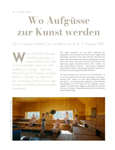 Wo Aufg%u00fcsse zur Kunst werdenWenn sich Duft, Dampf und Dramaturgie zu einem Erlebnis f%u00fcr alle Sinne verbinden, dann ist nicht einfach nur Sauna %u2013 dann ist Herbal Cup. Im August wird das Bahia in Bocholt zur B%u00fchne f%u00fcr ein einmaliges Sauna-Event, das K%u00f6rper und Seele gleicherma%u00dfen begeistert.Wer denkt, Saunieren sei nur stilles Schwitzen bei ged%u00e4mpftem Licht, der sollte sich den 16. und 17. August 2025 unbedingt vormerken. Denn dann wird die Saunawelt des Bahia in Bocholt zur B%u00fchne f%u00fcr eines der aufregendsten SaunaEvents des Jahres, den Sauna Herbal Cup Germany. Zwei Tage lang zeigen Saunameisterinnen und -meister aus ganz Deutschland ihr K%u00f6nnen %u2013 mit kreativen Aufg%u00fcssen, spektakul%u00e4ren D%u00fcften und au%u00dfergew%u00f6hnlichen Zeremonien, die K%u00f6rper und Sinne gleicherma%u00dfen ber%u00fchren.Der Sauna Herbal Cup ist mehr als nur ein Wettbewerb - er ist ein internationales Festival der Saunakultur. Saunameisterinnen und -meister aus aller Welt pr%u00e4sentieren dabei ihre Kunst %u2013 mit fantasievollen Aufg%u00fcssen, eindrucksvollen Choreografien und viel Gesp%u00fcr f%u00fcr ein stimmiges Gesamtergebnis. Von klassischen Aufg%u00fcssen %u00fcber Banja-Zeremonien bis hin zu Peelings, Klangschalenmomenten und duftender Kr%u00e4uter-R%u00e4ucherung.Der 3. Sauna Herbal Cup im Bahia am 16. & 17. August 2025104 I Living & LifestyleAdvertorial | Fotos: Bahia | Text: Kirsten Bu%u00df