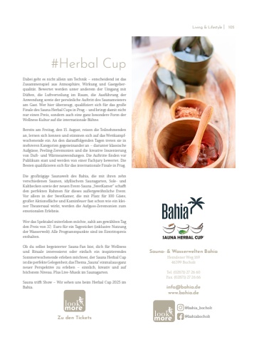 Dabei geht es nicht allein um Technik %u2013 entscheidend ist das Zusammenspiel aus Atmosph%u00e4re, Wirkung und Gastgeberqualit%u00e4t. Bewertet werden unter anderem der Umgang mit D%u00fcften, die Luftverteilung im Raum, die Ausf%u00fchrung der Anwendung sowie der pers%u00f6nliche Auftritt des Saunameisters am Gast. Wer hier %u00fcberzeugt, qualifiziert sich f%u00fcr das gro%u00dfe Finale des Sauna Herbal Cups in Prag %u2013 und bringt damit nicht nur einen Preis, sondern auch eine ganz besondere Form der Wellness-Kultur auf die internationale B%u00fchne.Bereits am Freitag, den 15. August, reisen die Teilnehmenden an, lernen sich kennen und stimmen sich auf das Wettkampfwochenende ein. An den darauffolgenden Tagen treten sie in mehreren Kategorien gegeneinander an %u2013 darunter klassische Aufg%u00fcsse, Peeling-Zeremonien und die kreative Inszenierung von Duft- und W%u00e4rmeanwendungen. Die Auftritte finden vor Publikum statt und werden von einer Fachjury bewertet. Die Besten qualifizieren sich f%u00fcr das internationale Finale in Prag.Die gro%u00dfz%u00fcgige Saunawelt des Bahia, die mit ihren zehn verschiedenen Saunen, idyllischem Saunagarten, Sole- und Kaltbecken sowie der neuen Event-Sauna %u201eSwetKamer%u201c schafft den perfekten Rahmen f%u00fcr dieses au%u00dfergew%u00f6hnliche Event. Vor allem in der SwetKamer, die mit Platz f%u00fcr 100 G%u00e4ste, gro%u00dfer Aktionsfl%u00e4che und Kaminfeuer fast schon wie ein kleiner Theatersaal wirkt, werden die Aufguss-Zeremonien zum emotionalen Erlebnis.Wer das Spektakel miterleben m%u00f6chte, zahlt am gew%u00e4hlten Tag den Preis von 37,- Euro f%u00fcr ein Tagesticket (inklusive Nutzung der Wasserwelt). Alle Programmpunkte sind im Eintrittspreis enthalten.Ob du selbst begeisterter Sauna-Fan bist, dich f%u00fcr Wellness und Rituale interessierst oder einfach ein inspirierendes Sommerwochenende erleben m%u00f6chtest, der Sauna Herbal Cup ist die perfekte Gelegenheit, das Thema %u201eSauna%u201c einmal aus ganz neuer Perspektive zu erleben %u2013 sinnlich, kreativ und auf h%u00f6chstem Niveau. Plus Live-Musik im Saunagarten.Sauna trifft Show %u2013 Wir sehen uns beim Herbal Cup 2025 im Bahia.Zu den TicketsSauna- & Wasserwelten BahiaHemdener Weg 16946399 BocholtTel. (02871) 27 26 60Fax. (02871) 27 26 66info@bahia.dewww.bahia.de @bahia_bocholt @bahiabocholt#Herbal CupLiving & Lifestyle I 105