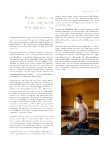 #Sommersauna#Saunagarten#Urlaubsfeelingsondern eine bewusste Auszeit mitten in ihm. Die W%u00e4rme, das Wasser, die D%u00fcfte, die Stille %u2013 all das hat meinen K%u00f6rper und Geist auf eine ganz eigene Weise neu sortiert. Ich bin am Abend entspannt, klar im Kopf und gleichzeitig voller Energie nach Hause gefahren.Sommersauna belebt die Sinne, vielleicht sogar mehr als in der kalten Jahreszeit. Sie erfrischt anders, sie entspannt tiefer %u2013 und vor allem l%u00e4sst sie einen das Hier und Jetzt ganz bewusst genie%u00dfen. F%u00fcr mich war dieser Nachmittag im Bahia genau das, ein achtsamer Start ins Wochenende. Und ganz sicher nicht das letzte Mal, dass ich bei Hochsommer in die Sauna gehe.Fazit: Auch bei hohen Temperaturen lohnt sich ein Saunagang %u2013 vielleicht sogar besonders dann. Der K%u00f6rper ist bereits warm, kommt schneller ins Schwitzen und entgiftet intensiver. Der Kreislauf wird angeregt, die Haut durchblutet, der Stoffwechsel aktiviert. Gleichzeitig trainiert der K%u00f6rper seine Hitzetoleranz %u2013 das macht ihn widerstandsf%u00e4higer gegen Sommerhitze. Kalte Duschen oder Tauchbecken wirken im Anschluss besonders erfrischend und st%u00e4rken das Immunsystem. Und nicht zuletzt, die ruhige Atmosph%u00e4re der Sauna bietet einen wohltuenden Kontrast zum Trubel drau%u00dfen %u2013 f%u00fcr mentale Entspannung und besseren Schlaf trotz hei%u00dfer N%u00e4chte.dieser besonderen Mischung aus Natur, Holz und W%u00e4rme. Ich suche mir einen sonnigen Platz auf einer der Liegen, sp%u00fcre die Hitze auf der Haut und lasse mich einfach treiben. Kein Stress, keine Termine, nur das Zwitschern der V%u00f6gel, das Pl%u00e4tschern des Wassers und ein ganz feiner Hauch von %u00e4therischen %u00d6len in der Luft.Was viele untersch%u00e4tzen, Sauna im Sommer ist keine Mutprobe oder verr%u00fcckte Idee %u2013 sie ist ein echter Wohlf%u00fchlmoment. Der K%u00f6rper ist durch die Au%u00dfentemperatur schon auf Betriebstemperatur, das Schwitzen f%u00e4llt leichter, die Abk%u00fchlung danach wirkt noch intensiver, fast wie ein kleiner Kreislauf-Kick. Ich g%u00f6nne mir erst einen Gang in der angenehm warmen Baumhaussauna, dann von der Dusche direkt ins Abk%u00fchlbecken, sp%u00e4ter ins wunderbar entspannende Solebecken. Das salzige Wasser tr%u00e4gt mich fast schwerelos, w%u00e4hrend ich tief durchatme und die Augen schlie%u00dfe. Zwischen den Saunag%u00e4ngen liegen, lesen, d%u00f6sen %u2013 es ist einfach alles da, was man braucht, um vollkommen abzuschalten.Und dann ist da noch die neue Swet Kamer %u2013 mein pers%u00f6nliches Highlight an diesem Tag. Allein die Architektur beeindruckt mich immer wieder aufs Neue. 80 Quadratmeter gro%u00df, Platz f%u00fcr bis zu 100 G%u00e4ste, gro%u00dfz%u00fcgige Holzb%u00e4nke, angenehme Beleuchtung, viel Raum zum Atmen. Aber was diese Sauna wirklich besonders macht, ist die 30 Quadratmeter gro%u00dfe Aktionsfl%u00e4che im Zentrum. Hier zelebrieren die Saunameister nicht einfach nur Aufg%u00fcsse %u2013 sie inszenieren sie. Es wird nicht nur aufgegossen und gewedelt, sondern mit Licht, Musik und Bewegung eine richtige Show geboten, bei der jeder Aufguss zu einem Erlebnis wird. Ich durfte eine dieser Zeremonien live miterleben %u2013 und war ehrlich gesagt ziemlich beeindruckt. Die Luft wird dichter, die Aromen intensiver, die Atmosph%u00e4re fast meditativ. Das Publikum ist still, aufmerksam, respektvoll %u2013 man sp%u00fcrt, hier geht es um mehr als ums Schwitzen. Es geht ums Erleben.Besonders sch%u00f6n ist auch der Kamin, der sowohl von innen als auch au%u00dfen sichtbar ist. W%u00e4hrend die Hitze in der Swet Kamer langsam aufsteigt und man in die Entspannung gleitet, flackert das Feuer ruhig im Hintergrund. Es verleiht der ganzen Szenerie auch eine optische W%u00e4rme %u2013 fast schon wie ein inneres Licht, das Ruhe und Geborgenheit spendet.Und genau das ist es, was diesen Saunanachmittag so besonders gemacht hat. Es war keine Flucht vor dem Sommer, Living & Lifestyle I 107