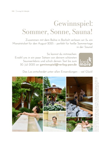 Gewinnspiel: Sommer, Sonne, Sauna!Zusammen mit dem Bahia in Bocholt verlosen wir 2%u00d7 ein Monatsticket f%u00fcr den August 2025 %u2013 perfekt f%u00fcr hei%u00dfe Sommertage in der Sauna!So kannst du mitmachen:Erz%u00e4hl uns in ein paar S%u00e4tzen von deinem sch%u00f6nsten Saunaerlebnis und schick deinen Text bis zum 30. Juli 2025 an gewinnspiel@verlag-pan.deDas Los entscheidet unter allen Einsendungen %u2013 viel Gl%u00fcck!Teilnahmebedingungen: Teilnahme ab 18 Jahren. Einsendeschluss ist der 30. Juli 2025. Der Rechtsweg ist ausgeschlossen. Mit deiner Teilnahme erkl%u00e4rst du dich einverstanden, dass dein Beitrag ggf. redaktionell gek%u00fcrzt im PAN-Magazin (print und online) sowie in den Seiten der sozialen Medien vom PAN und vom Bahia ver%u00f6ffentlicht werden darf.108 I Living & Lifestyle