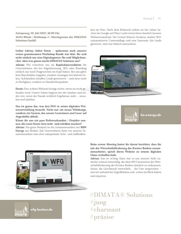Zeitsprung | 01. Juli 2025 | 10.00 Uhr 46414 Rhede | Holtkamp 2 | Meetingraum der DIMATA%u00ae Solutions GmbHLieber Adrian, lieber Denis %u2013 sp%u00e4testens nach unserer ersten gemeinsamen Workshop-Runde war klar: Ihr seid nicht einfach nur eine Digitalagentur. Ihr seid M%u00f6glichmacher. Aber was genau macht DIMATA%u00ae Solutions aus?Adrian: Wir verstehen uns als Kopfschmerztablette f%u00fcr Unternehmen, die bei Digitalisierung, SEO oder Branding einfach nur noch Fragezeichen im Kopf haben. Bei uns gibt%u2019s kein Bauchladen-Angebot, sondern L%u00f6sungen mit klarem Fokus: Sichtbarkeit schaffen, Leads generieren %u2013 und zwar nicht in Hochglanz, sondern in Handwerksqualit%u00e4t.Denis: Eine sch%u00f6ne Webseite bringt nichts, wenn sie nicht gefunden wird. Unsere Arbeit beginnt bei der Analyse und endet erst, wenn der Kunde wirklich Ergebnisse sieht %u2013 messbar und sp%u00fcrbar.Das ist genau das, was den PAN in seiner digitalen Weiterentwicklung braucht. Nicht nur ein neues Webdesign, sondern ein System, das unsere Leserinnen und Leser auf Augenh%u00f6he abholt. K%u00f6nnt ihr uns ein paar Referenzkunden /-Projekte nennen, die eurer Know-how sicht- und erlebbar machen?Adrian: Ein gutes Beispiel ist die Zusammenarbeit mit B&W Energy aus Heiden. Das Unternehmen hatte vor unserer Zusammenarbeit eine eher suboptimale Sicht- und Auffindbarkeit im Netz. Nach dem Relaunch stehen sie bei vielen Suchen bei Google auf Platz 1 und verzeichnen deutlich bessere Webseitenaufrufe. Der Grund: Klarere Struktur, starker SEO, automatisierte Contentpflege und eine Startseite, die Leads generiert, statt nur h%u00fcbsch auszusehen.Beim ersten Meeting hattet ihr davon berichtet, dass ihr mit der Wirtschaftsf%u00f6rderung des Kreises Borken zusammenarbeitet, sprich deren Website zu neuem digitalen Glanz verholfen habt. Adrian: Das ist richtig. Dazu war es aus unserer Sicht zun%u00e4chst einmal notwendig, die %u00fcber 180 Unterseiten der Wirtschaftsf%u00f6rderung des Kreises Borken deutlich zu reduzieren. Seiten, die Geschmack entwickeln ... die User ansprechen %u2013 was wir anhand der Zugriffsdaten und -zeiten im Blick haben und reporten. bw-energy.dewfg-borken.de#DIMATA%u00ae Solutions#jung#charmant#pr%u00e4zisePortrait 111 I