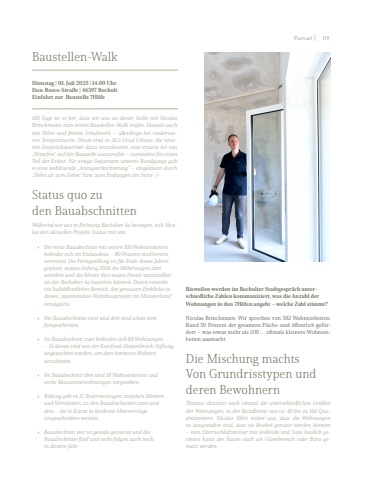 Baustellen-Walk Dienstag | 01. Juli 2025 | 14.00 Uhr Don-Bosco-Stra%u00dfe | 46397 BocholtEinfahrt zur Baustelle 7H%u00f6fe 410 Tage ist es her, dass wir uns an dieser Stelle mit Nicolas Brinckmann zum ersten Baustellen-Walk trafen. Damals auch mit Helm und festem Schuhwerk %u2013 allerdings bei moderateren Temperaturen. Heute sind es 36,5 Grad Celsius, die unseren Gespr%u00e4chspartner dazu veranlassten, eine smarte Art von %u201eHitzefrei%u201c auf der Baustelle auszurufen %u2013 zumindest f%u00fcr einen Teil der Kr%u00e4ne. F%u00fcr einige Sequenzen unseres Rundgangs gab es eine wohltuende %u201eAnzugserleichterung%u201c %u2013 eingel%u00e4utet durch %u201eHelm ab zum Gebet%u201c bzw. zum Einfangen der Story ;-) Status quo zuden BauabschnittenW%u00e4hrend wir uns in Richtung Bocholter Aa bewegen, teilt Nicolas den aktuellen Projekt-Status mit uns: %u203a Der erste Bauabschnitt mit seinen 106 Wohneinheiten befindet sich im Endausbau %u2013 80 Prozent sind bereits vermietet. Die Fertigstellung ist f%u00fcr Ende dieses Jahres geplant, sodass Anfang 2026 die M%u00f6belwagen dort anrollen und die Mieter ihre neuen Nester unmittelbar an der Bocholter Aa beziehen k%u00f6nnen. Damit entsteht ein halb%u00f6ffentlicher Bereich, der genauere Einblicke in dieses %u201espannendste Wohnbauprojekt im M%u00fcnsterland%u201c erm%u00f6glicht. %u203a Die Bauabschnitte zwei und drei sind schon weit fortgeschritten. %u203a Im Bauabschnitt zwei befinden sich 88 Wohnungen %u2013 51 davon sind von der Kardinal-Diepenbrock-Stiftung angepachtet worden, um dort betreutes Wohnen anzubieten. %u203a Im Bauabschnitt drei sind 18 Wohneinheiten und sechs Maisonettewohnungen vorgesehen.%u203a Bislang gibt es 37 Reservierungen zwischen Mietern und Vermietern, zu den Bauabschnitten zwei und drei %u2013 die in K%u00fcrze in konkrete Mietvertr%u00e4ge umgeschrieben werden. %u203a Bauabschnitt vier ist gerade gestartet und die Bauabschnitte f%u00fcnf und sechs folgen auch noch in diesem Jahr.Bisweilen werden im Bocholter Stadtgespr%u00e4ch unterschiedliche Zahlen kommuniziert, was die Anzahl der Wohnungen in den 7H%u00f6fen angeht %u2013 welche Zahl stimmt? Nicolas Brinckmann: Wir sprechen von 382 Wohneinheiten. Rund 50 Prozent der gesamten Fl%u00e4che sind %u00f6ffentlich gef%u00f6rdert %u2013 was etwas mehr als 200 %u2026 oftmals kleinere Wohneinheiten ausmacht. Die Mischung machtsVon Grundrisstypen undderen BewohnernThomas skizziert noch einmal die unterschiedlichen Gr%u00f6%u00dfen der Wohnungen, in der Bandbreite von ca. 40 bis zu 144 Quadratmetern. Nicolas f%u00fchrt weiter aus, dass die Wohnungen so ausgestaltet sind, dass sie flexibel genutzt werden k%u00f6nnen %u2013 vom Elternschlafzimmer mit Ankleide und Suite baulich getrennt kann der Raum auch als G%u00e4stebereich oder B%u00fcro genutzt werden. Portrait I 119