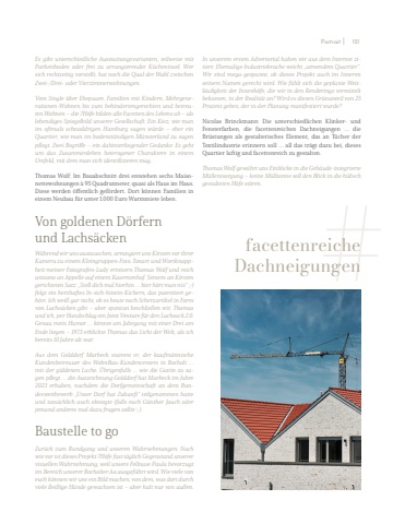 Es gibt unterschiedliche Ausstattungsvarianten, teilweise mit Parkettboden oder frei zu arrangierender K%u00fccheninsel. Wer sich rechtzeitig vorstellt, hat noch die Qual der Wahl zwischen Zwei-/Drei- oder Vierzimmerwohnungen. Vom Single %u00fcber Ehepaare, Familien mit Kindern, Mehrgenerationen-Wohnen bis zum behindertengerechten und betreuten Wohnen %u2013 die 7H%u00f6fe bilden alle Facetten des Lebens ab %u2013 als lebendiges Spiegelbild unserer Gesellschaft. Ein Kiez, wie man im oftmals schnoddrigen Hamburg sagen w%u00fcrde %u2013 eher ein Quartier, wie man im bodenst%u00e4ndigen M%u00fcnsterland zu sagen pflegt. Zwei Begriffe %u2013 ein dahinterliegender Gedanke: Es geht um das Zusammenleben heterogener Charaktere in einem Umfeld, mit dem man sich identifizieren mag. Thomas Wolf: Im Bauabschnitt drei entstehen sechs Maisonettewohnungen %u00e0 95 Quadratmeter, quasi als Haus im Haus. Diese werden %u00f6ffentlich gef%u00f6rdert. Dort k%u00f6nnen Familien in einem Neubau f%u00fcr unter 1.000 Euro Warmmiete leben. Von goldenen D%u00f6rfernund Lachs%u00e4ckenW%u00e4hrend wir uns austauschen, arrangiert uns Kirsten vor ihrer Kamera zu einem Kleingruppen-Foto. Tonart und Wortknappheit meiner Fotografen-Lady erinnern Thomas Wolf und mich unisono an Appelle auf einem Kasernenhof. Seinem an Kirsten gerichteten Satz: %u201eStell dich mal hierhin %u2026 hier h%u00f6rt man nix%u201c ;-) folgt ein herzhaftes In-sich-hinein-Kichern, das patentiert geh%u00f6rt. Ich wei%u00df gar nicht, ob es heute noch Scherzartikel in Form von Lachs%u00e4cken gibt %u2013 aber spontan beschlie%u00dfen wir, Thomas und ich, per Handschlag ein Joint Venture f%u00fcr den Lachsack 2.0. Genau mein Humor %u2026 k%u00f6nnte am Jahrgang mit einer Drei am Ende liegen %u2013 1973 erblickte Thomas das Licht der Welt, als ich bereits 10 Jahre alt war. Aus dem Golddorf Marbeck stammt er, der kaufm%u00e4nnische Kundenbetreuuer des WohnBau-Kundencenters in Bocholt %u2026 mit der g%u00fcldenen Lache. %u00dcbrigenfalls %u2026 wie die Gattin zu sagen pflegt %u2026 die Auszeichnung Golddorf hat Marbeck im Jahre 2023 erhalten, nachdem die Dorfgemeinschaft an dem Bundeswettbewerb %u201eUnser Dorf hat Zukunft%u201c teilgenommen hatte und tats%u00e4chlich auch obsiegte (falls euch G%u00fcnther Jauch oder jemand anderes mal dazu fragen sollte ;-) Baustelle to goZur%u00fcck zum Rundgang und unseren Wahrnehmungen: Nach wie vor ist dieses Projekt 7H%u00f6fe fast t%u00e4glich Gegenstand unserer visuellen Wahrnehmung, weil unsere Fellnase Paula bevorzugt im Bereich unserer Bocholter Aa ausgef%u00fchrt wird. Wie viele von euch k%u00f6nnen wir uns ein Bild machen, von dem, was dort durch viele flei%u00dfige H%u00e4nde gewachsen ist %u2013 aber halt nur von au%u00dfen. In unserem ersten Advertorial haben wir aus dem Internet zitiert: Ehemalige Industriebrache weicht %u201eatmendem Quartier%u201c. Wir sind mega-gespannt, ob dieses Projekt auch im Inneren seinem Namen gerecht wird. Wie f%u00fchlt sich die geplante Weitl%u00e4ufigkeit der Innenh%u00f6fe, die wir in den Renderings vermittelt bekamen, in der Realit%u00e4t an? Wird es diesen Gr%u00fcnanteil von 25 Prozent geben, der in der Planung manifestiert wurde? Nicolas Brinckmann: Die unterschiedlichen Klinker- und Fensterfarben, die facettenreichen Dachneigungen %u2026 die Br%u00fcstungen als gestalterisches Element, das an T%u00fccher der Textilindustrie erinnern soll %u2026 all das tr%u00e4gt dazu bei, dieses Quartier luftig und facettenreich zu gestalten. Thomas Wolf gew%u00e4hrt uns Einblicke in die Geb%u00e4ude-integrierte M%u00fcllentsorgung %u2013 keine M%u00fclltonne soll den Blick in die h%u00fcbsch gestalteten H%u00f6fe st%u00f6ren. facettenreicheDachneigungen #Portrait 121 I