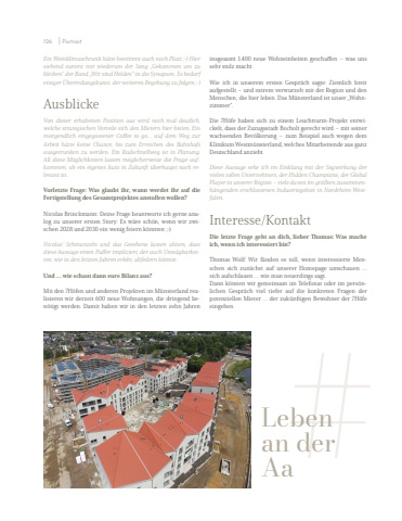 insgesamt 1.400 neue Wohneinheiten geschaffen %u2013 was uns sehr stolz macht. Wie ich in unserem ersten Gespr%u00e4ch sagte: Ziemlich breit aufgestellt %u2013 und extrem verwurzelt mit der Region und den Menschen, die hier leben. Das M%u00fcnsterland ist unser %u201eWohnzimmer%u201c. Die 7H%u00f6fe haben sich zu einem Leuchtturm-Projekt entwickelt, dass der Zuzugsstadt Bocholt gerecht wird %u2013 mit seiner wachsenden Bev%u00f6lkerung %u2013 zum Beispiel auch wegen dem Klinikum Westm%u00fcnsterland, welches Mitarbeitende aus ganz Deutschland anzieht. Diese Aussage sehe ich im Einklang mit der Sogwirkung der vielen tollen Unternehmen, der Hidden Champions, der Global Player in unserer Region %u2013 viele davon im gr%u00f6%u00dften zusammenh%u00e4ngenden erschlossenen Industriegebiet in Nordrhein-Westfalen. Interesse/Kontakt Die letzte Frage geht an dich, lieber Thomas: Was mache ich, wenn ich interessiert bin? Thomas Wolf: Wir f%u00e4nden es toll, wenn interessierte Menschen sich zun%u00e4chst auf unserer Homepage umschauen %u2026 sich aufschlauen %u2026 wie man neuerdings sagt. Dann k%u00f6nnen wir gemeinsam im Telefonat oder im pers%u00f6nlichen Gespr%u00e4ch viel tiefer auf die konkreten Fragen der potenziellen Mieter %u2026 der zuk%u00fcnftigen Bewohner der 7H%u00f6fe eingehen.Ein Weinklimaschrank h%u00e4tte bestimmt auch noch Platz ;-) Hier stehend summt mir wiederum der Song %u201eGekommen um zu bleiben%u201c der Band %u201eWir sind Helden%u201c in die Synapsen. Es bedarf einiger %u00dcberredungskunst, der weiteren Begehung zu folgen ;-)Ausblicke Von dieser erhabenen Position aus wird noch mal deutlich, welche strategischen Vorteile sich den Mietern hier bieten. Ein morgendlich eingegossener Coffee to go%u2026 auf dem Weg zur Arbeit h%u00e4tte keine Chance, bis zum Erreichen des Bahnhofs ausgetrunken zu werden. Ein Radschnellweg ist in Planung. All diese M%u00f6glichkeiten lassen m%u00f6glicherweise die Frage aufkommen, ob ein eigenes Auto in Zukunft %u00fcberhaupt noch relevant ist. Vorletzte Frage: Was glaubt ihr, wann werdet ihr auf die Fertigstellung des Gesamtprojektes ansto%u00dfen wollen? Nicolas Brinckmann: Deine Frage beantworte ich gerne analog zu unserer ersten Story: Es w%u00e4re sch%u00f6n, wenn wir zwischen 2028 und 2030 ein wenig feiern k%u00f6nnten ;-) Nicolas%u2019 Schmunzeln und das Gesehene lassen ahnen, dass diese Aussage einen Puffer impliziert, der auch Unw%u00e4gbarkeiten, wie in den letzten Jahren erlebt, abfedern k%u00f6nnte. Und %u2026 wie schaut dann eure Bilanz aus? Mit den 7H%u00f6fen und anderen Projekten im M%u00fcnsterland realisieren wir derzeit 600 neue Wohnungen, die dringend ben%u00f6tigt werden. Damit haben wir in den letzten zehn Jahren Lebenan derAa#126 I Portrait