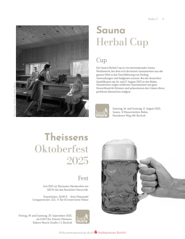 Samstag, 16. und Sonntag, 17. August 2025, Sauna- & Wasserwelten Bahia,Hemdener Weg 169, BocholtKulturseitensponsoring durch Stadtsparkasse BocholtSauna Herbal CupFreitag, 19. und Samstag, 20. September 2025,ab 17.00 Uhr, Fliesen Theissen, Robert-Bosch-Stra%u00dfe 1-5, BocholtCupDer Sauna Herbal Cup ist ein internationaler SaunaWettbewerb, bei dem sich die besten Saunameister aus der ganzen Welt in der Durchf%u00fchrung von PeelingAnwendungen und Aufg%u00fcssen messen. Bei der deutschen Qualifikation am 16. und 17. August 2025 in den BahiaSaunawelten zeigen erfahrene Saunameister aus ganz Deutschland ihr K%u00f6nnen und pr%u00e4sentieren den G%u00e4sten ihren perfekten klassischen Aufguss. Foto: Sauna- & Wasserwelten BahiaFestSeit 2013 ist Theissens Oktoberfest ein MUSS f%u00fcr das Bocholter Partyvolk.Einzelticket: 24,90 %u20ac, - freie PlatzwahlGruppenticket: 222,- %u20ac f%u00fcr 10 reservierte Pl%u00e4tzeTheissens Oktoberfest 2025Kultur 11 I