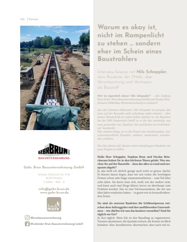 Warum es okay ist, nicht im Rampenlicht zu stehen %u2026 sondern eher im Schein eines Baustrahlers Interview-Session mit Nils Schappler, dem Bauleiter der 7H%u00f6fe, %u00fcber Verantwortung und Vertrauen als BaustoffWer ist eigentlich dieser Nils Schappler? %u2026 den Stephan Brun (Gebr. Brun Bauunternehmung GmbH) und Nicolas Brinckmann (WohnBau Westm%u00fcnsterland) so sch%u00e4tzen? Aus den Stimmen billanziert: Nils Schappler ist jemand, den man auf der Baustelle nicht unbedingt sofort erkennt %u2013 aber dessen Handschrift an vielen Stellen sp%u00fcrbar ist. Als Bauleiter bei der DMS Baubetrieb GmbH ist er f%u00fcr das zust%u00e4ndig, was man gemeinhin mit %u201eQualit%u00e4t, Zeit und Kosten im Griff behalten%u201c beschreibt. Was trocken klingt, ist in der Praxis eine hochkomplexe, zwischenmenschliche Disziplin: zuh%u00f6ren, moderieren, entscheiden, erkl%u00e4ren. Die Zeit scheint reif, diesem extern beauftragten Bauleiter ein paar Fragen zu stellen:Hallo Herr Schappler, Stephan Brun und Nicolas Brinckmann haben Sie in den h%u00f6chsten T%u00f6nen gelobt. Was machen Sie auf der Baustelle %u2013 dass das alles so rund und entspannt abgeht?Ja, das wei%u00df ich ehrlich gesagt auch nicht so genau. (lacht). Es k%u00f6nnte daran liegen, dass wir mit vielen der beteiligten Firmen schon sehr lange zusammenarbeiten %u2013 zum Teil %u00fcber zehn Jahre. Da kennt man sich, wei%u00df, wie der andere tickt, und kann auch mal Dinge kl%u00e4ren, bevor sie %u00fcberhaupt zum Problem werden. Das ist eine Vertrauensebene, die wir uns %u00fcber Jahre erarbeitet haben %u2013 in guten wie in herausfordernden Zeiten.Sie sind als externer Bauleiter die Schl%u00fcsselperson zwischen dem Auftraggeber und den ausf%u00fchrenden Unternehmen %u2013 wie d%u00fcrfen wir uns das konkret vorstellen? Sind Sie t%u00e4glich vor Ort?Ja, fast t%u00e4glich. Mein Job ist den Baualltag zu organisieren: Termine abstimmen, die Qualit%u00e4t sichern, die Kosten im Blick behalten. Also: koordinieren, %u00fcberwachen, aber auch viel zuGebr. Brun Bauunternehmung GmbHSchulze-Delitzsch-Str. 8-1646359 HeidenT. 02867 - 8011 - 0info@gebr-brun.de www.gebr-brun.de @brunbauunternehmung @Gebr%u00fcder Brun Bauunternehmung GmbH 130 I Portrait