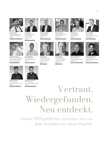 J%u00f6rg SchaffeldH%u00e4uptling eigener HerdLandhaus Gr%u00fcnekleeBorkenlandhaus-grueneklee.deSebastian ThiemeKaufm. Leiter & Mitglied der Gesch%u00e4ftsf%u00fchrungFliesen H%u00fcning OHGfliesen-huening.deJohannes TelaarGesch%u00e4ftsf%u00fchrerGarten Grandiflora GmbHBocholtgarten-grandiflora.deSven Pierongesch%u00e4ftsf%u00fchrenderGesellschafterPieron GmbHBocholtpieron.international Roland H%u00fcningGesch%u00e4ftsf%u00fchrerFliesen H%u00fcning OHGBocholtfliesen-huening.deDavid ZimmermannGesch%u00e4ftsf%u00fchrerGarten Grandiflora GmbHBocholtgarten-grandiflora.deChristian FehlerGesch%u00e4ftsf%u00fchrerPieron GmbHBocholtpieron.internationalG%u00fcnter BrunGesch%u00e4ftsf%u00fchrungGebr. Brun Bauunternehmung GmbH,Heiden,gebr-brun.deHannah PieronMarketing ManagerinPieron GmbHBocholtpieron.internationalStephan BrunGesch%u00e4ftsf%u00fchrungGebr. Brun Bauunternehmung GmbH,Heiden,gebr-brun.deGisela PieronGesellschafterinPieron GmbHBocholtpieron.internationalChristian BollmannGesch%u00e4ftsf%u00fchrerBollmann Metalltechnik GmbH, Reesbollmann-metalltechnik.deNils SchapplerDipl.-Ing. (FH)DMS Baubetrieb GmbHL%u00fcdinghausendms-baubetrieb.deSebastian HegmannGesch%u00e4ftsf%u00fchrerBollmann Metalltechnik GmbH, Reesbollmann-metalltechnik.deUnsere PANgef%u00e4hrten schreiben mit uns jede Ausgabe ein neues Kapitel.Vertraut. Wiedergefunden. Neu entdeckt. 139