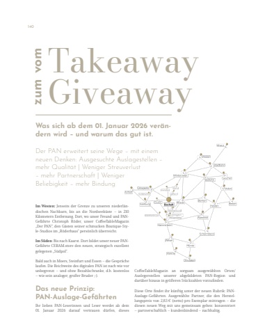 Takeaway Giveawayvom zumWas sich ab dem 01. Januar 2026 ver%u00e4ndern wird %u2013 und warum das gut ist.Der PAN erweitert seine Wege %u2013 mit einem neuen Denken: Ausgesuchte Auslagestellen %u2013 mehr Qualit%u00e4t | Weniger Streuverlust %u2013 mehr Partnerschaft | Weniger Beliebigkeit %u2013 mehr BindungIm Westen: Jenseits der Grenze zu unseren niederl%u00e4ndischen Nachbarn, bis an die Nordseek%u00fcste %u2013 in 210 Kilometern Entfernung. Dort, wo unser Freund und PANGef%u00e4hrte Christoph R%u00f6der, unser CoffeeTableMagazin%u201eDer PAN%u201c, den G%u00e4sten seiner schmucken Boutique-Style-Studios im %u201eR%u00f6derhaus%u201c pers%u00f6nlich %u00fcberreicht. Im S%u00fcden: Bis nach Kaarst. Dort bildet unser neuer PANGef%u00e4hrte CERAM.store den neuen, strategisch exzellent gelegenen %u201eS%u00fcdpol%u201c. Bald auch in Moers, Steinfurt und Essen %u2013 die Gespr%u00e4che laufen. Die Reichweite des digitalen PAN ist nach wie vor unbegrenzt %u2013 und ohne Bezahlschranke, d.h. kostenlos %u2013 wie sein analoger, gro%u00dfer Bruder ;-).Das neue Prinzip: PAN-Auslage-Gef%u00e4hrtenIhr lieben PAN-Leserinnen und Leser werdet ab dem01. Januar 2026 darauf vertrauen d%u00fcrfen, dieses CoffeeTableMagazin an sorgsam ausgew%u00e4hlten Orten/ Auslegerstellen unserer abgebildeten PAN-Region unddar%u00fcber hinaus in gr%u00f6%u00dferen St%u00fcckzahlen vorzufinden. Diese Orte findet ihr k%u00fcnftig unter der neuen Rubrik: PANAuslage-Gef%u00e4hrten. Ausgew%u00e4hlte Partner, die den Herstellungspreis von 2,83 %u20ac (netto) pro Exemplar mittragen %u2013 die diesen neuen Weg mit uns gemeinsam gehen: konzentriert %u2013 partnerschaftlich %u2013 kundenbindend %u2013 nachhaltig. 140