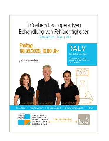 Augenlaser | Multifokallinsen | Alterssichtigkeit | Brillenunabh%u00e4ngigkeit | RALVLaser-24 GmbH www.Laser-24.deK%u00f6nigstr. 23, BocholtTel.: 02871 22 66 26 LASER-24 GmbHoptik@Laser-24.deInfoabend zur operativenBehandlung von FehlsichtigkeitenMultifokallinsen %u2502 Laser %u2502 RALVReal Artificial Lens VisionErleben Sie schon jetzt, wie Sie nach der Linsen-OP sehen werden!Freitag, 08.08.2025, 10.00 Uhr Jetzt anmelden!Dr. Friederike D%u00f6rner (FEBO) Fach%u00e4rztin f%u00fcr AugenheilkundeRALV Real Artificial Lens VisionDr. Johanna D%u00f6rner Fach%u00e4rztin f%u00fcr AugenheilkundeDr. Martin D%u00f6rner Facharzt f%u00fcr AugenheilkundeHier anmelden