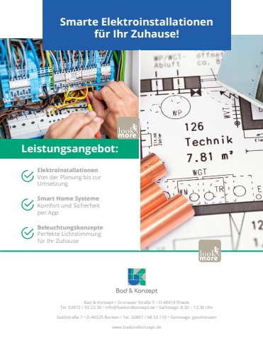 Bad & Konzept %u2022 Gronauer Stra%u00dfe 5 %u2022 D-46414 RhedeTel. 02872 / 93 22 30 %u2022 info@badundkonzept.de %u2022 Samstags: 8:30 %u2013 12:30 UhrGoldstra%u00dfe 7 %u2022 D-46325 Borken %u2022 Tel. 02861 / 68 53 110 %u2022 Samstags: geschlossenwww.badundkonzept.deSmarte Elektroinstallationen f%u00fcr Ihr Zuhause!Leistungsangebot:ElektroinstallationenVon der Planung bis zur UmsetzungSmart Home SystemeKomfort und Sicherheit per AppBeleuchtungskonzeptePerfekte Lichtstimmung f%u00fcr Ihr Zuhause