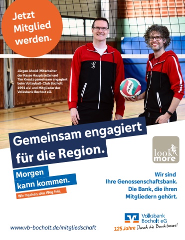 Jetzt Mitglied werden.Wir sind Ihre Genossenschaftsbank.Die Bank, die ihrenMitgliedern geh%u00f6rt.www.vb-bocholt.de/mitgliedschaftkann kommen.MorgenWir machen den Weg frei.f%u00fcr die Region.Gemeinsam engagiertJ%u00fcrgen Ahold (Mitarbeiter der Kasse Hauptstelle) und Tim Kreutz gemeinsam engagiert beim Volleyball-Club Bocholt 1991 e.V. und Mitglieder der Volksbank Bocholt eG.