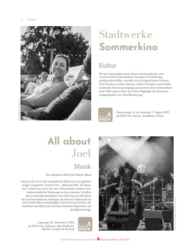 Donnerstag, 14. bis Sonntag, 17. August 2025, ab 19.00 Uhr, Auesee, Auedamm, WeselStadtwerkeSommerkinoKulturWo die Atmosph%u00e4re eines lauen Sommerabends, eine wundersch%u00f6ne Naturkulisse und gute Unterhaltung aufeinandertreffen, entsteht ein unvergessliches Erlebnis. Vier Kinohits, leckere Speisen, k%u00fchle Getr%u00e4nke und atemberaubende Sonnenunterg%u00e4nge garantieren dem Sommerkino auch 2025 seinen Platz als echtes Highlight im Veranstaltungskalender von WeselMarketing.Foto: Wesel TourismusAll about JoelMusik Die ultimative Billy-Joel-Tribute-BandTauchen Sie ein in die musikalische Welt eines der gr%u00f6%u00dften Singer-Songwriter unserer Zeit %u2013 Billy Joel! Mit %u201eAll About Joel%u201c erleben Sie nicht nur eine Tributeband, sondern eine leidenschaftliche Hommage an das immense Schaffen dieses Ausnahmek%u00fcnstlers. Seit 2021 hat sich All About Joel aus bescheidenen Anf%u00e4ngen im kleinen Proberaum zu einer kraftvollen sechsk%u00f6pfigen Formation entwickelt, die das Beste aus Billy Joels beeindruckendem Repertoire auf die B%u00fchne bringt. Foto: Leon F%u00fclber, Astrid SchmitzSamstag, 06. September 2025, ab 20.00 Uhr, Kulturort Alte Molkerei,Werther Stra%u00dfe 16, BocholtKulturseitensponsoring durch Stadtsparkasse Bocholt14 I Kultur