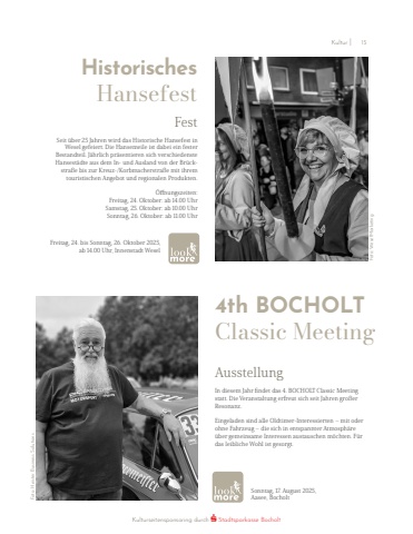 AusstellungIn diesem Jahr findet das 4. BOCHOLT Classic Meeting statt. Die Veranstaltung erfreut sich seit Jahren gro%u00dfer Resonanz.Eingeladen sind alle Oldtimer-Interessierten %u2013 mit oder ohne Fahrzeug %u2013 die sich in entspannter Atmosph%u00e4re %u00fcber gemeinsame Interessen austauschen m%u00f6chten. F%u00fcr das leibliche Wohl ist gesorgt.Sonntag, 17. August 2025,Aasee, Bocholt4th BOCHOLT Classic MeetingHistorischesHansefestFestSeit %u00fcber 25 Jahren wird das Historische Hansefest in Wesel gefeiert. Die Hansemeile ist dabei ein fester Bestandteil. J%u00e4hrlich pr%u00e4sentieren sich verschiedenste Hansest%u00e4dte aus dem In- und Ausland von der Br%u00fcckstra%u00dfe bis zur Kreuz-/Korbmacherstra%u00dfe mit ihrem touristischen Angebot und regionalen Produkten. %u00d6ffnungszeiten:Freitag, 24. Oktober: ab 14.00 UhrSamstag, 25. Oktober: ab 10.00 UhrSonntag, 26. Oktober: ab 11.00 Uhr Freitag, 24. bis Sonntag, 26. Oktober 2025, ab 14.00 Uhr, Innenstadt Wesel Foto: WeselMarketingFoto: Heister Business SolutionsKulturseitensponsoring durch Stadtsparkasse BocholtKultur I 15