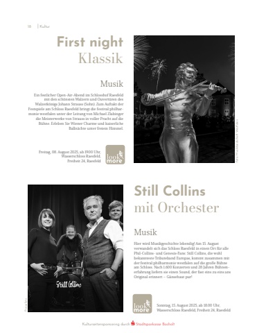 First nightKlassikMusikEin festlicher Open-Air-Abend im Schlosshof Raesfeld mit den sch%u00f6nsten Walzern und Ouvert%u00fcren des Walzerk%u00f6nigs Johann Strauss (Sohn). Zum Auftakt der Festspiele am Schloss Raesfeld bringt die festival:philharmonie westfalen unter der Leitung von Michael Zlabinger die Meisterwerke von Strauss in voller Pracht auf die B%u00fchne. Erleben Sie Wiener Charme und kaiserliche Balln%u00e4chte unter freiem Himmel.MusikHier wird Musikgeschichte lebendig! Am 15. August verwandelt sich das Schloss Raesfeld in einen Ort f%u00fcr alle Phil-Collins- und Genesis-Fans: Still Collins, die wohl bekannteste Tributeband Europas, kommt zusammen mit der festival:philharmonie westfalen auf die gro%u00dfe B%u00fchne am Schloss. Nach 1.600 Konzerten und 28 Jahren B%u00fchnenerfahrung liefern sie einen Sound, der fast eins zu eins ans Original erinnert %u2013 G%u00e4nsehaut pur!Sonntag, 15. August 2025, ab 18.00 Uhr, Wasserschloss Raesfeld, Freiheit 24, RaesfeldFoto: Musiklandschaft WestfalenStill Collinsmit OrchesterFreitag, 08. August 2025, ab 19.00 Uhr, Wasserschloss Raesfeld, Freiheit 24, RaesfeldPressefotoKulturseitensponsoring durch Stadtsparkasse Bocholt18 I Kultur