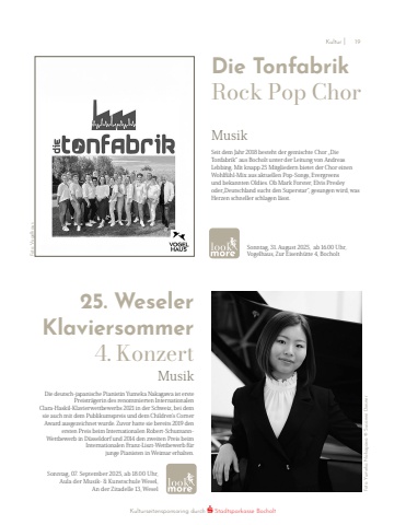 Sonntag, 31. August 2025, ab 16.00 Uhr,Vogelhaus, Zur Eisenh%u00fctte 4, BocholtDie TonfabrikRock Pop ChorSonntag, 07. September 2025, ab 18.00 Uhr, Aula der Musik- & Kunstschule Wesel, An der Zitadelle 13, WeselMusikSeit dem Jahr 2018 besteht der gemischte Chor %u201eDie Tonfabrik%u201c aus Bocholt unter der Leitung von Andreas Lebbing. Mit knapp 25 Mitgliedern bietet der Chor einen Wohlf%u00fchl-Mix aus aktuellen Pop-Songs, Evergreens und bekannten Oldies. Ob Mark Forster, Elvis Presley oder%u201eDeutschland sucht den Superstar%u201c, gesungen wird, was Herzen schneller schlagen l%u00e4sst.Foto: VogelhausFoto: Yumeka Nakagawa %u00a9 Susanne DiesnerMusikDie deutsch-japanische Pianistin Yumeka Nakagawa ist erste Preistr%u00e4gerin des renommierten Internationalen Clara-Haskil-Klavierwettbewerbs 2021 in der Schweiz, bei dem sie auch mit dem Publikumspreis und dem Children%u2019s Corner Award ausgezeichnet wurde. Zuvor hatte sie bereits 2019 den ersten Preis beim Internationalen Robert-SchumannWettbewerb in D%u00fcsseldorf und 2014 den zweiten Preis beim Internationalen Franz-Liszt-Wettbewerb f%u00fcr junge Pianisten in Weimar erhalten.25. Weseler Klaviersommer 4. KonzertKulturseitensponsoring durch Stadtsparkasse BocholtKultur I 19