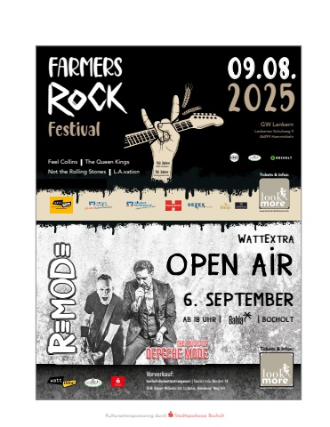 09.08.2025FARMERSFestivalRoCKGW Lankern Lankerner Schulweg 9 46499 Hamminkeln www.bocholt.de/farmersrockTickets & Infos:GW Lankern 50 Jahre50 JahreRockgeschichte Die g%u00fcnstige Energie aus Bocholt.www.wattextra.deBesser BEW.Feel Collins | The Queen KingsNot the Rolling Stones | L.A.vationTHE MUSIC OF THE MUSIC OF RemodeDEPECHE MODE DEPECHE MODE Open AirWATTEXTRA6. SEPTEMBER ab 18 Uhr | | BocholtVorverkauf:bocholt.de/wattextraopenair | Tourist Info, Nordstr. 14BEW, Kaiser-Wilhelm-Str. 1 | Bahia, Hemdener Weg 169 www.bocholt.de/wattextraopenairTickets & Infos:Kulturseitensponsoring durch Stadtsparkasse Bocholt