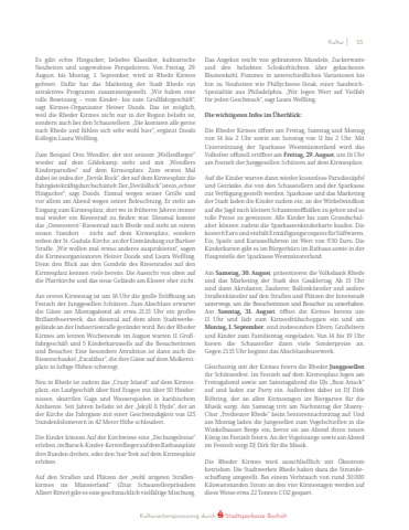 Es gibt echte Hingucker, beliebte Klassiker, kulinarische Neuheiten und ungewohnte Perspektiven. Von Freitag, 29. August, bis Montag, 1. September, wird in Rhede Kirmes gefeiert. Daf%u00fcr hat das Marketing der Stadt Rhede ein attraktives Programm zusammengestellt. %u201eWir haben eine tolle Besetzung %u2013 vom Kinder- bis zum Gro%u00dffahrgesch%u00e4ft%u201c, sagt Kirmes-Organisator Heiner Doods. Das ist m%u00f6glich, weil die Rheder Kirmes nicht nur in der Region beliebt ist, sondern auch bei den Schaustellern. %u201eDie kommen alle gerne nach Rhede und f%u00fchlen sich sehr wohl hier%u201c, erg%u00e4nzt Doods Kollegin Laura We%u00dfling. Zum Beispiel Otto Wendler, der mit seinem %u201eWellenflieger%u201c wieder auf dem Gildekamp steht und mit %u201eWendlers Kinderparadies%u201c auf dem Kirmesplatz. Zum ersten Mal dabei ist indes der %u201eDevils Rock%u201c, der auf dem Kirmesplatz die Fahrg%u00e4ste kr%u00e4ftig durchsch%u00fcttelt. Der %u201eDevils Rock%u201c ist ein %u201eechterHingucker%u201c, sagt Doods. Einmal wegen seiner Gr%u00f6%u00dfe und vor allem am Abend wegen seiner Beleuchtung. Er steht am Eingang zum Kirmesplatz, dort wo in fr%u00fcheren Jahren immer mal wieder ein Riesenrad zu finden war. Diesmal kommt das %u201eOstseestern%u201c-Riesenrad nach Rhede und steht an einem neuen Standort - nicht auf dem Kirmesplatz, sondern neben der St.-Gudula-Kirche, an der Einm%u00fcndung zur Burloer Stra%u00dfe. %u201eWir wollen mal etwas anderes ausprobieren%u201c, sagen die Kirmesorganisatoren Heiner Doods und Laura We%u00dfling. Denn den Blick aus den Gondeln des Riesenrades auf den Kirmesplatz kennen viele bereits. Die Aussicht von oben auf die Pfarrkirche und das neue Gel%u00e4nde am Kloster eher nicht.Am ersten Kirmestag ist um 16 Uhr die gro%u00dfe Er%u00f6ffnung am Festzelt der Junggesellen-Sch%u00fctzen. Zum Abschluss erwartetdie G%u00e4ste am Montagabend ab etwa 21.15 Uhr ein gro%u00dfes Brillantfeuerwerk, das diesmal auf dem alten Stadtwerkegel%u00e4nde an der Industriestra%u00dfe gez%u00fcndet wird. Bei der Rheder Kirmes am letzten Wochenende im August warten 11 Gro%u00dffahrgesch%u00e4ft und 5 Kinderkarussells auf die Besucherinnen und Besucher. Eine besondere Attraktion ist dann auch die Riesenschaukel %u201eExcalibur%u201c, die ihre G%u00e4ste auf dem Molkereiplatz in luftige H%u00f6hen schwingt. Neu in Rhede ist zudem das %u201eCrazy Island%u201c auf dem Kirmesplatz, ein Laufgesch%u00e4ft %u00fcber f%u00fcnf Etagen mit %u00fcber 50 Hindernissen, skurrilen Gags und Wasserspielen in karibischem Ambiente. Seit Jahren beliebt ist der %u201eJekyll & Hyde%u201c, der an der Kirche die Fahrg%u00e4ste mit einer Geschwindigkeit von 125 Stundenkilometern in 42 Meter H%u00f6he schleudert. Die Kinder k%u00f6nnen Auf der Kirchwiese eine %u201eDschungelreise%u201cerleben, im Barock-Kinder-Kettenflieger auf dem Rathausplatzihre Runden drehen, oder den Star Trek auf dem Kirmesplatz erleben. Auf den Stra%u00dfen und Pl%u00e4tzen der %u201ewohl urigsten Stra%u00dfenkirmes im M%u00fcnsterland%u201c (Zitat Schaustellerpr%u00e4sident Albert Ritter) gibt es eine geschmacklich vielf%u00e4ltige Mischung. Das Angebot reicht von gebrannten Mandeln, Zuckerwatteund den beliebten Schokofr%u00fcchten %u00fcber gebackenen Blumenkohl, Pommes in unterschiedlichen Variationen bis hin zu Neuheiten wie Phillycheese-Steak, einer SandwichSpezialit%u00e4t aus Philadelphia. %u201eWir legen Wert auf Vielfaltf%u00fcr jeden Geschmack%u201c, sagt Laura We%u00dfling. Die wichtigsten Infos im %u00dcberblick:Die Rheder Kirmes %u00f6ffnet am Freitag, Samstag und Montagvon 14 bis 2 Uhr sowie am Sonntag von 11 bis 2 Uhr. Mit Unterst%u00fctzung der Sparkasse Westm%u00fcnsterland wird das Volksfest offiziell er%u00f6ffnet am Freitag, 29. August, um 16 Uhr am Festzelt der Junggesellen-Sch%u00fctzen auf dem Kirmesplatz.Auf die Kinder warten dann wieder kostenlose Paradies%u00e4pfel und Getr%u00e4nke, die von den Schaustellern und der Sparkasse zur Verf%u00fcgung gestellt werden. Sparkasse und das Marketing der Stadt laden die Kinder zudem ein, an der Wirbelwindbox auf die Jagd nach kleinen Schaumstoffb%u00e4llen zu gehen und so tolle Preise zu gewinnen. Alle Kinder bis zum Grundschulalter k%u00f6nnen zudem die Sparkassenkinderkarte kaufen. Die kostet 6 Euro und enth%u00e4lt Erm%u00e4%u00dfigungscoupons f%u00fcr S%u00fc%u00dfwaren,Eis, Spiele und Karusselfahrten im Wert von 9.50 Euro. Die Kinderkarten gibt es im B%u00fcrgerb%u00fcro im Rathaus sowie in der Hauptstelle der Sparkasse Westm%u00fcnsterland. Am Samstag, 30. August, pr%u00e4sentieren die Volksbank Rhedeund das Marketing der Stadt den Gauklertag. Ab 15 Uhr sind dann Akrobaten, Zauberer, Ballonk%u00fcnstler und andere Stra%u00dfenk%u00fcnstler auf den Stra%u00dfen und Pl%u00e4tzen der Innenstadt unterwegs, um die Besucherinnen und Besucher zu unterhalten. Am Sonntag, 31. August, %u00f6ffnet die Kirmes bereits um 11 Uhr und l%u00e4dt zum Kirmesfr%u00fchschoppen ein und am Montag, 1. September, sind insbesondere Eltern, Gro%u00dfelternund Kinder zum Familientag eingeladen. Von 14 bis 19 Uhr bieten die Schausteller dann viele Sonderpreise an.Gegen 21.15 Uhr beginnt das Abschlussfeuerwerk. Gleichzeitig mit der Kirmes feiern die Rheder Junggesellenihr Sch%u00fctzenfest. Im Festzelt auf dem Kirmesplatz legen am Freitagabend sowie am Samstagabend die DJs %u201eBeat Attack%u201c auf und laden zur Party ein. Au%u00dferdem dabei ist DJ Dirk R%u00f6hring, der an allen Kirmestagen im Biergarten f%u00fcr die Musik sorgt. Am Samstag tritt am Nachmittag der ShantyChor %u201eFreibeuter Rhede%u201c beim Seniorennachmittag auf. Und am Montag laden die Jungesellen zum Vogelschie%u00dfen in die Winkelhauser Berge ein, bevor sie am Abend ihren neuen K%u00f6nig im Festzelt feiern. An der Vogelstange sowie am Abend im Festzelt sorgt DJ Dirk f%u00fcr die Musik. Die Rheder Kirmes wird ausschlie%u00dflich mit %u00d6kostrom betrieben. Die Stadtwerken Rhede haben dazu die Strombeschaffung um