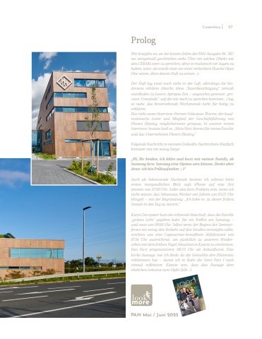 PrologWir kn%u00fcpfen an, an die letzten Zeilen der PAN-Ausgabe Nr. 307, wo sinngem%u00e4%u00df geschrieben steht: %u00dcber ein solches Objekt wie den CERAM.store zu sprechen, ohne es realistisch vor Augen zu haben, w%u00e4re, als w%u00fcrde man vor einer verkorkten Flasche Opus One sitzen, ohne dessen Duft zu atmen ;-) Der Duft lag zwar noch nicht in der Luft, allerdings die beiderseits erkl%u00e4rte Absicht, diese %u201eTatortbesichtigung%u201c zeitnah stattfinden zu lassen. Apropos Zeit %u2013 angesichts gewisser %u201eprivater Umst%u00e4nde%u201c, auf die wir noch zu sprechen kommen ;-) lag es nahe, das bevorstehende Wochenende nicht f%u00fcr heilig zu erkl%u00e4ren. Das sieht unser Interview-Partner Sebastian Thieme, der kaufm%u00e4nnische Leiter und Mitglied der Gesch%u00e4ftsf%u00fchrung von Fliesen H%u00fcning, m%u00f6glicherweise genauso. In unserer ersten Interview-Session hie%u00df es: %u201eMein Herz brennt f%u00fcr meine Familie und das Unternehmen Fliesen H%u00fcning.%u201cFolgende Nachricht in meinem LinkedIn-Nachrichten-Postfach bereitete mir ein wenig Sorge: %u201eHi, Ihr beiden, ich kl%u00e4re mal kurz mit meiner Family, ob Samstag bzw. Sonntag eine Option sein k%u00f6nnte. Denkt aber dran: ich bin Fr%u00fchaufsteher. ;-)%u201cAuch als bekennende Nachteule komme ich seltenst beim ersten morgendlichen Blick aufs iPhone auf eine Zeit jenseits von 07.00 Uhr. Sollte also kein Problem sein, wenn ich nicht w%u00fcsste, das Sebastians Wecker seit Jahren um 03.25 Uhr klingelt %u2013 mit der Begr%u00fcndung: %u201eIch liebe es, zu dieser fr%u00fchen Stunde in den Tag zu starten.%u201c Kurze Zeit sp%u00e4ter kam die erl%u00f6sende Botschaft, dass die Familie%u201egr%u00fcnes Licht%u201c gegeben habe, f%u00fcr ein Treffen am Samstag %u2013 und zwar um 09.00 Uhr. Selbst wenn der Beginn der Sommerferien ein wenig den Verkehr auf den Stra%u00dfen verstopfen sollte, erschien uns eine Cappuccino-bewaffnete Abfahrtszeit von 07.14 Uhr ausreichend, um p%u00fcnktlich zu unserem Wiedersehen mit dem fr%u00fchen Vogel Sebastian in Kaarst zu erscheinen. Das Navi prognostizierte 08.23 Uhr als Ankunftszeit. Eine kecke Aussage, wie ich finde, da die Gemahlin den Pilotensitz erklommen hat %u2013 damit ich in Ruhe die Story Part I noch einmal reflektiere. K%u00f6nnte sein, dass dies Passage dem ehelichen Lektorat zum Opfer f%u00e4llt ;-) PAN Mai / Juni 2025Coverstory I 27