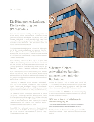 Die H%u00fcning%u2019schen Laufwege | Die Erweiterung des (PAN-)Radius Viele von euch werden den Weg zum Hauptquartier von Fliesen H%u00fcning auf der Dinxperloer Str. 331 kennen. F%u00fcr die Noch-nicht-Wissenden: einfach die Dinxperloer Stra%u00dfe hoch Richtung Niederlande %u2026 am Kreisverkehr links raus. Wenn man nach dem Ortsausgangsschild von Bocholt Gas gibt, muss man schon wieder abbremsen %u2026 den Blinker links setzen, um auf das Firmengel%u00e4nde einzubiegen. Beim Lesen dieser Passage f%u00e4llt mir auf, dass der Belastungstest f%u00fcr den besonderen Parkplatz noch aussteht: %u201eKomfortParken auf 30-mm-Fliesen%u201c verspricht das Schild. Sebastian ist zuversichtlich, dass auch unser 2,3 Tonnen schwerer Untersatz in Form eines Land Rover Defender keinen Haftpflichtversicherungsfall ausl%u00f6sen wird. Heute allerdings nehmen wir Kurs auf die im Jahre 2023 er%u00f6ffnete Fliesen-H%u00fcning-Dependance in Kaarst. Gemeinsam mit dem Bocholter Traditionsunternehmen erweitern wir den Laufweg des PAN auf die 85-Kilometer-Marke, westlich von D%u00fcsseldorf %u2013 unserer zuk%u00fcnftig s%u00fcdlichsten Auslagestelle. Exakt 176 Exemplare unseres Coffeetable-Magazins Der PAN werden ab Ende Juli 2025 in der dortigen Kaffee-Lounge ausliegen. Was es mit der offensichtlich unrunden Zahl auf sich hat, k%u00f6nnten euch Kommunikationstrainer Sebastian oder ich auf Nachfrage erz%u00e4hlen ;-) Cappuccino in Griffweite, (noch) aktueller, lesegeschmeidiger PAN in den H%u00e4nden, am%u00fcsiere ich mich angesichts einiger Passagen aus dem letzten Interview. Mein humorvoll gemeintes: %u201eManchmal bekomme ich Respekt vor meiner eigenen Schreibe%u201c wertet Kirsten als Anflug einer Profilneurose ;-) Die Vorfreude auf ein abermaliges Eintauchen in sch%u00f6ne Geschichten %u2026 auf den Austausch mit Sebastian steigt. Zudem bin ich gespannt wie ein Flitzebogen, dieses Geb%u00e4ude mit seiner europaweit einzigartigen Fassade endlich in natura zu sehen%u2013 und die dahinterliegenden Storys aufzusaugen. Komplett Ferienverkehrs-frei, die Autobahn %u2013 die Gemahlin %u201epeitscht%u201c unseren PAN-Verteilungs-Boliden gen S%u00fcden. Gegen 08.17 Uhr %u2026 also nach knapp einer Stunde Fahrtzeit nimmt Kirsten die Ausfahrt 18 (Holzb%u00fcttgen) und f%u00e4hrt von der A57 ab. Ein wei%u00dfes Schild lotst uns in Richtung IKEA |Industriegebiet Kaarster Kreuz. Sidestep: Kleines schwedisches Familienunternehmen mit vier Buchstaben Wusstet Ihr eigentlich, dass es neben dem Besuch des CERAM.store mit seiner europaweit einmaligen Fassade einen weiteren gewichtigen Grund geben d%u00fcrfte, nach Kaarst zureisen %u2013 insbesondere f%u00fcr die IKEA-Freaks unter euch? Dort steht n%u00e4mlich eine IKEA-Filiale, die weltweit einzigartig ist, wie es Sebastian erw%u00e4hnt und eine Pressmeldung aus dem Business-Insider verk%u00fcndet hat: IKEA baut in Kaarst ein M%u00f6belhaus, das weltweit einzigartig ist.Quelle: https://www.businessinsider.de/wirtschaft/ikea-baut-inkaarst-ein-moebelhaus-das-weltweit-einzigartig-ist-2017-5/Zwei Superlative, die ihresgleichen suchen, quasi in nachbarschaftlicher Sichtweite %u2013 neun Minuten Fu%u00dfweg voneinander entfernt. 28 I Coverstory