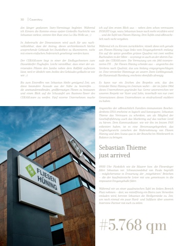 des l%u00e4nger geplanten Story-Vormittags begleitet. W%u00e4hrend ich Kirsten die Komme-etwas-sp%u00e4ter-LinkedIn-Nachricht von Sebastian vorlese, stimmt ihre Rute eine La-Ola-Welle an ;-)In Anbetracht der Dimensionen wird auch f%u00fcr uns nachvollziehbar, dass der Antrag, dieses architektonisch h%u00f6chst ansprechende Geb%u00e4ude bei Dunkelheit zu illuminieren, nicht mit einem einfachen Federstrich genehmigt werden kann. Der CERAM.store liegt in einer der Einflugschneisen zum D%u00fcsseldorfer Flughafen. Leicht vorstellbar, dass einer der anreisenden Piloten den Jumbo neben dem Rollfeld aufsetzen l%u00e4sst, weil er %u00e4hnlich vom Antlitz des Geb%u00e4udes geflasht ist wie wir ;-) Bis zum Eintreffen von Sebastian bleibt gen%u00fcgend Zeit, um diese besondere Fassade aus der N%u00e4he zu bestreifen %u2026die aneinandersto%u00dfenden, gro%u00dfformatigen Fliesen zu bestaunen und einen Blick auf die Schautafel am Business-Tower des CERAM.store zu werfen. F%u00fcnf externe Unternehmen mache ich auf den ersten Blick aus %u2013 neben dem schon vertrauten INSIGHT-Logo, wozu Sebastian heute noch mehr erz%u00e4hlen wird %u2026 und die Tafel von Fliesen H%u00fcning. Drei Tafeln sind offensichtlich noch nicht vergeben. W%u00e4hrend ich zu Kirsten zur%u00fcckkehre, r%u00e4tselt diese sich gerade am Fliesen-H%u00fcning-Logo links vom Eingangsbereich entlang: Ein auf die spitze gestelltes gr%u00fcnes Quadrat mit zwei wei%u00dfen Buchstaben in der Mitte %u2013 so prangt es auch an der oberen Fassade des CERAM.store. Die Vermutung um ein fehl-interpretiertes FH %u2026 f%u00fcr Fliesen H%u00fcning scheidet aus %u2013 angesichts des Strebens nach Qualit%u00e4t, das uns bislang entgegengeschlagen ist. Eine versteckte Hommage an unsere Zweit-Lieblingsstadt, die Hansestadt Hamburg, erscheint ebenfalls abwegig. Es kann nur ein Zeichen des Respekts sein, das den Gr%u00fcnder Heinz H%u00fcning im Zentrum wahrt %u2013 der im Jahre 1964 dieses Unternehmen gegr%u00fcndet hat. Gerne unterstreichen wir unseren Respekt vor Vater und Sohn, innerhalb von nur zwei Generationen dieses Unternehmen so eindrucksvoll etabliert zu haben. Angesichts der offensichtlich Familien-immanenten Bescheidenheits-DNA erscheint es logisch und konsequent, Sebastian Thieme das Vertrauen zu schenken, um als Mitglied der Gesch%u00e4ftsf%u00fchrung auch das Marketing auf das n%u00e4chste Level zu hieven. Dem Kommunikator, wie wir ihn im letzten PAN etikettiert haben, ist es eine Herzensangelegenheit, das Ungleichgewicht zwischen der Wahrnehmung von Fliesen H%u00fcning und dem Status quo in der Branche/im Wettbewerb in Balance zu bringen. Sebastian Thieme just arrived 09.00 Uhr: P%u00fcnktlich wie die Maurer bzw. die Fliesenleger f%u00e4hrt Sebastian vor. Schwanzwedelnd von Paula begr%u00fc%u00dft %u2013 m%u00f6glicherweise in Erwartung der %u201emitgeh%u00f6rten%u201c Br%u00f6tchen %u2013 die der kaufm%u00e4nnische Leiter mit uns gemeinsam in die imposante Eingangshalle f%u00fchrt. W%u00e4hrend wir an einer quadratischen Tafel im linken Bereich Platz nehmen %u2013 dort, wo mittelfristig ein Bistro zum Verweileneinladen wird, bereitet Sebastian die Hei%u00dfgetr%u00e4nke zu. Zeit, um noch einmal ein paar Hard- und Softfacts %u00fcber unseren Interview-Partner mit euch zu teilen: #5.768 qm30 I Coverstory