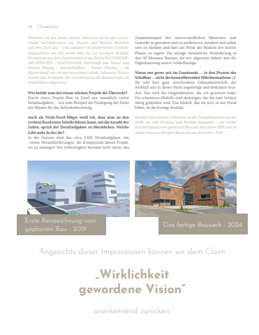 W%u00e4hrend ich das denke, breitet Sebastian ein kreativ anmutendes Sammelsurium aus Skizzen und kleinen Modellen auf dem Tisch aus %u2013 und simuliert die planerischen Entwicklungsschritte von der ersten Idee bis zur heutigen Realit%u00e4t. Gewachsen aus dem Zusammenspiel des Teams WIENSTROER | ARCHITEKTEN | STADTPLANER PartGmbB aus Neuss und Roland H%u00fcning | Gesch%u00e4ftsf%u00fchrer | Fliesen H%u00fcning %u2026 als Mastermind, wie ich das bezeichnen w%u00fcrde. Sebastian Thieme wurde zum Zeitpunkt der Genehmigung des Bauantrages als Projektleiter eingesetzt.Wie beh%u00e4lt man bei einem solchen Projekt die %u00dcbersicht? Durch einen Projekt-Plan in Excel mit unendlich vielen Detailaufgaben %u2026 wie zum Beispiel die Festlegung der Farbe der Masten f%u00fcr die Au%u00dfenbeleuchtung. Auch als Nicht-Excel-M%u00f6ger wei%u00df ich, dass man an den rechten Rand einer Tabelle fahren kann, um die Anzahl der Zeilen, sprich der Detailaufgaben zu %u00fcberblicken. Welche Zahl steht da bei dir? In der Summe sind das circa 3.500 Detailaufgaben, mit vielen Herausforderungen, die Komplexit%u00e4t dieses Projektes zu managen. Die Schwierigkeit bestand nicht darin, das Zusammenspiel der unterschiedlichen Menschen und Gewerke zu gestalten und zu moderieren, sondern sich selbst treu zu bleiben und hart am Wind der Realit%u00e4t des letzten Planes zu segeln. Die einzige wesentliche Ver%u00e4nderung in den 30 Monaten Bauzeit, die wir abgenickt haben, war die Digitalisierung unsere Schlie%u00dfanlage. Nimm uns gerne mit ins Emotionale %u2026 in den Prozess des Schaffens %u2026 nicht des kontrollierenden H%u00e4kchenmachens ;-) Ihr seht hier ganz verschiedene Geb%u00e4udeentw%u00fcrfe, die wirklich nur in dieser Form angefertigt und diskutiert wurden. Das sind die Originalmuster, die ich gesichert habe. Die schwarzen Modelle sind diejenigen, die bis zum Schluss %u00fcbrig geblieben sind. Das Modell, das du jetzt in der Hand h%u00e4ltst, ist die heutige Realit%u00e4t. Parallel dazu bl%u00e4ttert Sebastian in der Imagebrosch%u00fcre an die Stelle, wo sich Planung und Realit%u00e4t begegnen %u2013 zur ersten Reinzeichnung vom geplanten Bau aus dem Jahre 2019 und zu einem Foto vom fertigen Bauwerk aus dem Jahre 2024. Erste Reinzeichnung vom geplanten Bau - 2019Angesichts dieser Impressionen k%u00f6nnen wir dem Claim%u201eWirklichkeit gewordene Vision%u201canerkennend zunicken. Das fertige Bauwerk - 202432 I Coverstory