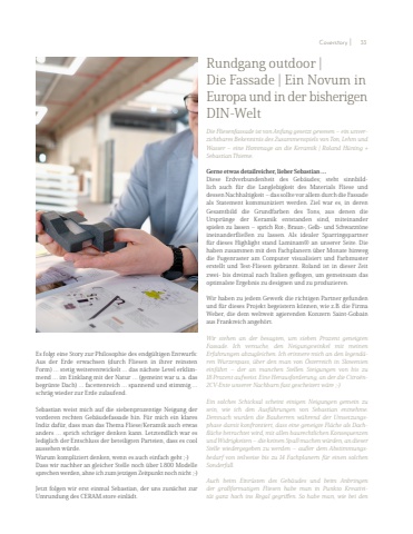 Es folgt eine Story zur Philosophie des endg%u00fcltigen Entwurfs: Aus der Erde erwachsen (durch Fliesen in ihrer reinsten Form) %u2026 stetig weiterentwickelt %u2026 das n%u00e4chste Level erklimmend %u2026 im Einklang mit der Natur %u2026 (gemeint war u. a. das begr%u00fcnte Dach) %u2026 facettenreich %u2026 spannend und stimmig %u2026 schr%u00e4g wieder zur Erde zulaufend. Sebastian weist mich auf die siebenprozentige Neigung der vorderen rechten Geb%u00e4udefassade hin. F%u00fcr mich ein klares Indiz daf%u00fcr, dass man das Thema Fliese/Keramik auch etwas anders %u2026 sprich schr%u00e4ger denken kann. Letztendlich war es lediglich der Entschluss der beteiligten Parteien, dass es cool aussehen w%u00fcrde. Warum kompliziert denken, wenn es auch einfach geht ;-) Dass wir nachher an gleicher Stelle noch %u00fcber 1.800 Modelle sprechen werden, ahne ich zum jetzigen Zeitpunkt noch nicht ;-) Jetzt folgen wir erst einmal Sebastian, der uns zun%u00e4chst zur Umrundung des CERAM.store einl%u00e4dt. Rundgang outdoor | Die Fassade | Ein Novum in Europa und in der bisherigen DIN-WeltDie Fliesenfassade ist von Anfang gesetzt gewesen %u2013 ein unverzichtbares Bekenntnis des Zusammenspiels von Ton, Lehm und Wasser %u2013 eine Hommage an die Keramik | Roland H%u00fcning + Sebastian Thieme.Gerne etwas detailreicher, lieber Sebastian %u2026Diese Erdverbundenheit des Geb%u00e4udes; steht sinnbildlich auch f%u00fcr die Langlebigkeit des Materials Fliese und dessen Nachhaltigkeit %u2013 das sollte vor allem durch die Fassadeals Statement kommuniziert werden. Ziel war es, in deren Gesamtbild die Grundfarben des Tons, aus denen die Urspr%u00fcnge der Keramik entstanden sind, miteinander spielen zu lassen %u2013 sprich Rot-, Braun-, Gelb- und Schwarzt%u00f6neineinanderflie%u00dfen zu lassen. Als idealer Sparringspartner f%u00fcr dieses Highlight stand Laminam%u00ae an unserer Seite. Die haben zusammen mit den Fachplanern %u00fcber Monate hinweg die Fugenraster am Computer visualisiert und Farbmuster erstellt und Test-Fliesen gebrannt. Roland ist in dieser Zeit zwei- bis dreimal nach Italien geflogen, um gemeinsam das optimalste Ergebnis zu designen und zu produzieren.Wir haben zu jedem Gewerk die richtigen Partner gefunden und f%u00fcr dieses Projekt begeistern k%u00f6nnen, wie z.B. die Firma Weber, die dem weltweit agierenden Konzern Saint-Gobain aus Frankreich angeh%u00f6rt.Wir stehen an der besagten, um sieben Prozent geneigten Fassade. Ich versuche, den Neigungswinkel mit meinen Erfahrungen abzugleichen. Ich erinnere mich an den legend%u00e4ren Wurzenpass, %u00fcber den man von %u00d6sterreich in Slowenieneinf%u00e4hrt %u2013 der an manchen Stellen Steigungen von bis zu 18 Prozent aufweist. Eine Herausforderung, an der die Citro%u00ebn2CV-Ente unserer Nachbarn fast gescheitert w%u00e4re ;-) Ein solches Schicksal scheint einigen Neigungen gemein zu sein, wie ich den Ausf%u00fchrungen von Sebastian entnehme. Demnach wurden die Bauherren w%u00e4hrend der Umsetzungsphase damit konfrontiert, dass eine geneigte Fl%u00e4che als Dachfl%u00e4che betrachtet wird, mit allen baurechtlichen Konsequenzen und Widrigkeiten %u2013 die keinen Spa%u00df machen w%u00fcrden, an dieser Stelle wiedergegeben zu werden %u2013 au%u00dfer dem Abstimmungsbedarf von teilweise bis zu 14 Fachplanern f%u00fcr einen solchen Sonderfall. Auch beim Einr%u00fcsten des Geb%u00e4udes und beim Anbringen der gro%u00dfformatigen Fliesen habe man in Punkto Kreativit%u00e4t ganz hoch ins Regal gegriffen. So habe man, wie bei den Coverstory I 33