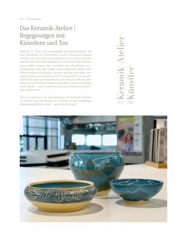 Das Keramik-Atelier | Begegnungen mit K%u00fcnstlern und Ton Martina M. Thies, eine namenhafte Keramikk%u00fcnstlerin, die zwei Jahrzehnte an Universit%u00e4ten in den Vereinigten Staaten dozierte, hat zwei Jahre lang dieses Areal mit ihrer Expertise und mit Kursen bespielt. Martina hat vor Kurzem die Entscheidung treffen m%u00fcssen, hier im Atelier des CERAM.store weiterzumachen oder den immer lauter werdenden Rufen ihrer Heimat Berlin nachzugehen. Letzteres gab den Ausschlag, weswegen Roland und Sebastian sich in Gespr%u00e4chen mit namenhaften K%u00fcnstlern und Experten aus der Branche befinden, aber bislang noch keine Entscheidung getroffen wurde, wer k%u00fcnftig in der Fl%u00e4che %u2026 unter anderem auch am vorhandenen Brennofen agieren wird. Ziel ist es nach wie vor, die Urspr%u00fcnge der Keramik erlebbar zu machen und die Br%u00fccke zu schlagen zu den vielf%u00e4ltigen Einsatzm%u00f6glichkeiten, jetzt %u2026 und in der Zukunft. #Keramik-Atelier #K%u00fcnstler 44 I Coverstory