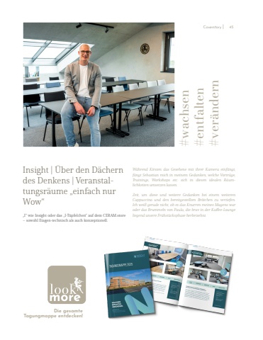 Insight | %u00dcber den D%u00e4chern des Denkens | Veranstaltungsr%u00e4ume %u201eeinfach nur Wow%u201c%u201eI%u201c wie Insight oder das %u201eI-T%u00fcpfelchen%u201c auf dem CERAM.store %u2013 sowohl Etagen-technisch als auch konzeptionell. W%u00e4hrend Kirsten das Gesehene mit ihrer Kamera einf%u00e4ngt, f%u00e4ngt Sebastian mich in meinem Gedanken, welche Vortr%u00e4ge,Trainings, Workshops etc. sich in diesen idealen R%u00e4umlichkeiten umsetzen lassen. Zeit, um diese und weitere Gedanken bei einem weiteren Cappuccino und den bereitgestellten Br%u00f6tchen zu vertiefen. Ich wei%u00df gerade nicht, ob es das Knurren meines Magens war oder das Brummeln von Paula, die brav in der Kaffee-Lounge liegend unsere Fr%u00fchst%u00fccksphase herbeisehnt. Die gesamte Tagungmappe entdecken!#wachsen #entfalten #ver%u00e4ndern Coverstory I 45