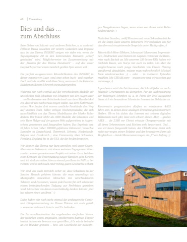 Dies und das %u2026 zum Abschluss Beim Teilen von Salami- und anderen Br%u00f6tchen, u. a. auch mit Fellnase Paula, tauschen wir weitere Gedanken und Impulse aus. In das Thema INSIGHT steigen wir tiefer ein, wenn die Tagungsmappe 2.0 in den kommenden Monaten %u201escharf geschaltet%u201c wird. M%u00f6glicherweise im Zusammenhang mit der %u201ePassion f%u00fcr das Thema Handwerk%u201c %u2013 auf das unser Gespr%u00e4chspartner einen ziemlich gro%u00dfen Spot setzen will. Die perfekt ausgestatteten R%u00e4umlichkeiten des INSIGHT, in dieser exponierten Lage, sind jetzt schon buch- und nutzbar. Doch zu Ende erz%u00e4hlt wird diese Story, wenn auch die kleinsten R%u00e4dchen in diesem Uhrwerk ineinandergreifen. W%u00e4hrend wir noch einmal auf die verschiedenen Modelle vor uns blicken, f%u00e4llt Sebastian wie Schuppen von den Augen oder %u2026 treffenderweise wie Br%u00f6tchenkr%u00fcmel aus dem Mundwinkel ein, dass er uns noch etwas zeigen wollte. Aus dem Kofferraum seines Pkw finden drei extrem amtliche Fotob%u00e4nde den Weg auf unseren Tisch. Selbst verlegte Nischenprodukte, die sich ausschlie%u00dflich um das Thema Modellautos der Marke Faller drehen. Der Inhalt: Mehr als 1.800 Modelle, die Sebastian und sein Vater Holger auf der ganzen Welt aufgetrieben, in Augenschein genommen und fotografiert haben. Das Ergebnis von: 10 Jahre Arbeit | %u00fcber 100.000 gefahrene Kilometer | besuchte Sammler in Deutschland, %u00d6sterreich, Schweiz, Niederlande, Belgien und Frankreich | eine Community %u00fcber Schweden, Finnland, England bis in die USA, die die beiden bespielen. Wir k%u00f6nnen das Thema nur kurz anrei%u00dfen, weil unser Gegen%u00fcber uns im Nebensatz mit einem weiteren Engagement %u00fcberrascht - einem gemeinsamen Projekt mit seiner Frau, bei dem es im Kern um die Unterst%u00fctzung junger Familien geht. Kirsten und ich sind uns sicher, hierzu einmal pro Bono im PAN zu berichten, weil es sich nach einer richtig guten Geschichte anh%u00f6rt.Wir sind uns auch ziemlich sicher ist, dass Sebastian zu der Spezies Mensch geh%u00f6ren k%u00f6nnte, die man neuerdings als Multigrafen bezeichnet. Menschen mit verschiedensten Talenten und Passionen, wovon jede Facette f%u00fcr sich schon mit einem beeindruckenden Tiefgang zur Perfektion getrieben wird. Menschen von denen man beil%u00e4ufig denken k%u00f6nnte: %u201eDer hat schwer einen am Brett.%u201c ;-) Dabei haben wir noch nicht einmal die umfangreiche Comicund H%u00f6rspielsammlung im Hause Thieme mit euch geteilt %u2013 worunter sich auch Asterix und Co. befinden. Die Batman-Faszination des angehenden vierfachen Vaters, der nat%u00fcrlich einen originalen, spielbereiten Batman-Flipper besitzt, haben wir bewusst nur gestriffen ;-) Es w%u00fcrde beinahe an ein Wunder grenzen %u2026 bzw. am Geschlecht der zuk%u00fcnftigen Neugeborenen liegen, wenn einer von ihnen nicht Robin hei%u00dfen w%u00fcrde ;-)Nach drei Stunden, zw%u00f6lf Minuten und neun Sekunden dr%u00fccke ich die Stopp-Taste unseres Rekorders. Wir bedanken uns f%u00fcr das abermals inspirierende Gespr%u00e4ch unter Multigrafen ;-)Mit reichlich Wow-Effekten, Schmunzel-Momenten, Impressionen, Eindr%u00fccken und Notizen im Gep%u00e4ck treten wir die Heimreise nach Bocholt an. Mit unserem 150-Seiten-PAN haben wir reichlich Raum, um Storys mit euch zu teilen. Um aber die vergleichsweise noch junge Geschichte von Fliesen H%u00fcning ann%u00e4hernd abzubilden, m%u00fcsste man wahrscheinlich Michael Ende wiedererwecken ;-) %u2013 oder %u2026 in mehreren Episoden erz%u00e4hlen. Mit CERAM.store %u2013 season one sind wir ja schon gut unterwegs ;-) Irgendwann wird die Zeit kommen, die Schreibfeder an nachfolgende Generationen zu %u00fcbergeben. F%u00fcr die Aufbewahrung der bisherigen Schriften (u. a. in Form der PAN-Ausgaben) bietet sich ein besonderer Schrein im Inneren des Geb%u00e4udes an. Konservativ prognostiziert d%u00fcrften es mindestens 4.605 Jahre sein, in denen diese analogen Erinnerungen konserviert bleiben. Ob es bis dahin das Internet mit seinem digitalen Weltwissen noch gibt, l%u00e4sst sich schwer ahnen. Aber %u2026 gro%u00dfes ABER %u2026 die 2.580 vor Christi erbaute Cheopspyramide mit all ihren Geheimnissen und Mythen steht heute noch. Und %u2026 wie wir heute festgestellt haben, der CERAM.store bietet sich nicht nur wegen seiner Erdt%u00f6ne und der besonderen Form als Vergleich an %u2013 beide Monumente tragen ein %u201eC%u201c am Anfang ;-) 48 I Coverstory