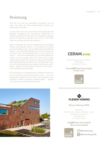 Fliesen H%u00fcning OHGStandorte:Bocholt | Goch | Kaarst | M%u00fclheim | EssenDinxperloer Stra%u00dfe 33146399 BocholtTel: +49 2871 2782 0info@fliesen-huening.defliesen-huening.deHanns-Martin-Schleyer Stra%u00dfe 541564 KaarstTel: 0049 2131 751120kaarst@fliesen-huening.deceram.store @fliesenhuening@Fliesen H%u00fcning OHG Besinnung 18.31 Uhr: Ich sitze am heimischen Schreibtisch, um bei einem Glas Wein die heute eingesammelten Notizen und Impressionen zu sichten. Es w%u00e4re schon cool, wenn unser Blaue-Stunde-Spezialist Jens Wiegrink irgendwann den illuminierten CERAM.store im %u00dcbergang zwischen D%u00e4mmerung und Dunkelheit einfangen k%u00f6nnte. Es br%u00e4uchte ja eigentlich nur ein Start- und Landeverbot von ein paar Stunden, f%u00fcrs Shooting ;-) Wenn es Menschen gibt, die das hinbekommen, dann Roland H%u00fcning und Sebastian Thieme ;-). Wir nehmen ein perfekt anmutendes Match wahr, von einem Menschen mit fundiertemMaurer- und Fliesenleger-Background und der Passion f%u00fcr das Thema Bau, dessen Berufswunsch es war, Architekt zu werden %u2026 und einem Multigrafen, der als Kommunikationstrainer ein feines Gesp%u00fcr daf%u00fcr hat, welche Storys erz%u00e4hlt werden sollten. Neben der vision%u00e4ren Leistung von Gesch%u00e4ftsf%u00fchrer Roland H%u00fcning beeindruckt uns vor allen Dingen seine Art, sich zur%u00fcckzunehmen und anderen die B%u00fchne zu %u00fcberlassen %u2013 %u00e4hnlich wie ein Intendant im Theater es tun w%u00fcrde %u2026 eines Leading Innovators w%u00fcrdig.PS: Am Dienstag vor der Begehung des CERAM.store waren wir bei der Verleihung des Red Dot Awards in Essen %u2026 wie in der kommenden Ausgabe zu lesen. Wenn sich irgendwann auch Geb%u00e4ude zu diesem Designpreis anstellen d%u00fcrfen %u2026 glauben wir zu ahnen, wer einen bekommen k%u00f6nnte. Coverstory I 49