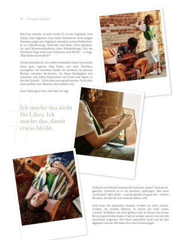 Was hier entsteht, ist kein Trend. Es ist ein Gegenpol. Zum Tempo. Zum Digitalen. Zum Dauer-Performen. Diese jungen Stimmen zeigen mir: Tagebuch schreiben ist kein R%u00fcckschritt. Es ist Selbstf%u00fcrsorge. Polaroids sind keine Retro-Spielerei. Sie sind Momentaufnahmen ohne Wiederholung. Und ein Notizbuch fragt nicht nach Followern und WLAN %u2013 es fragt: %u201eWas denkst du wirklich?%u201cIch bin beeindruckt, wie selbstverst%u00e4ndlich diese Generationihren ganz eigenen Weg findet, mit dem %u00dcberfluss umzugehen. Sie schreiben wieder. Sie zeichnen. Sie pressen Blumen zwischen Buchseiten. Sie falten Briefpapier und schreiben sich selbst Nachrichten auf Zettel und Papier in ihre die Zukunft%u2026 Nicht alles muss geteilt werden. Nicht alles muss perfekt sein. Manches darf einfach sein.Diese Haltung ist leise, aber klar. Sie sagt: #Vielleicht wird dieser Sommer f%u00fcr viele kein %u201elauter%u201c. Kein durchgestylter. Vielleicht ist er ein bisschen %u201eunfotogen%u201c oder auch %u201everwackelt%u201c. Aber daf%u00fcr %u2013 und das glaube ich ganz fest %u2013 wird er f%u00fcr diese, die das f%u00fcr sich entdeckt haben, echt.Und wenn der September kommt, werden sie nicht zur%u00fcckscrollen. Sie werden bl%u00e4ttern. In Seiten, die nach Sonne %u201eriechen%u201c. In Bildern, die nicht gefiltert sind. In Worten, die sie nur f%u00fcr sich geschrieben haben. Und sie werden sp%u00fcren, was wir alle manchmal vergessen: Wir leben tats%u00e4chlich nicht nur f%u00fcr den digitalen Content. Wir leben f%u00fcr echte Erinnerungen.Ich mache das nicht f%u00fcr Likes. Ich mache das, damit etwas bleibt.52 I Living & Lifestyle