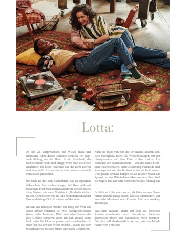 #Lotta: Ich bin 25, aufgewachsen mit WLAN, Insta und WhatsApp. Aber diesen Sommer schreibe ich Tagebuch. Richtig, mit der Hand. In ein Notizbuch, das nach Struktur riecht und klingt, wenn man die Seiten umbl%u00e4ttert. Ich klebe Polaroids ein, die nicht perfekt sind, aber wahr. Ich zeichne, kritzle, notiere %u2013 einfach, weil es sich gut anf%u00fchlt.F%u00fcr mich ist das kein R%u00fcckschritt. Das ist irgendwie Selbstschutz. Und vielleicht sogar Stil. Denn w%u00e4hrend mein Insta-Feed mich oftmals anschreit, wie ich zu sein habe, fl%u00fcstert mir mein Notizbuch: %u201eDu darfst einfach du sein. Geht keinen was an.%u201c Mit Sonnenbrand auf der Nase und Kringel-Schrift mitten auf der Seite.Warum das pl%u00f6tzlich wieder ein Ding ist? Weil das Leben offline ehrlicher ist. Weil handgeschriebene Worte mehr bedeuten. Weil kein Algorithmus der Welt Gef%u00fchle sortieren kann. Ich hab aktuell keine Bock mehr f%u00fcr Likes zu posten und zu schreiben. In einer Zeit, die sich wie fr%u00fcher anf%u00fchlt %u2013 so wie aus dem Fotoalbum von meinen Eltern oder auch Gro%u00dfeltern. Auch die Fotos von mir, die ich mache, %u00e4ndern sich. Kein Hochglanz, keine 100 Wiederholungen mit der Handykamera und fette Filter dr%u00fcber und so. Ein Klick mit der Polaroidkamera %u2013 und das war%u2019s. Lichtspur, Nasenschatten, echte Stimmung. Polaroids sind das Gegenteil von der Perfektion, die mich oft stresst. Und gerade deshalb h%u00e4ngen sie an meiner Wand, am Spiegel, an der W%u00e4scheleine %u00fcber meinem Bett. Weil sie zeigen: Das war jetzt. Unwiederholbar. Ich mag das %u2026Es f%u00fchlt sich f%u00fcr mich so an, als h%u00e4tte unsere Generation aktuell genug davon, alles zu optimieren. Wir sammeln Momente statt Content. Und wir merken, das tut gut.Was hier passiert, bleibt auf Seite xy. Zwischen Sonnencremeflecken und Eselsohren. Zwischen gepressten Bl%u00fcten und Kinotickets. Mein Sommerfahrplan soll diesbez%u00fcglich werden, wie ein Moodboard zum Anfassen.