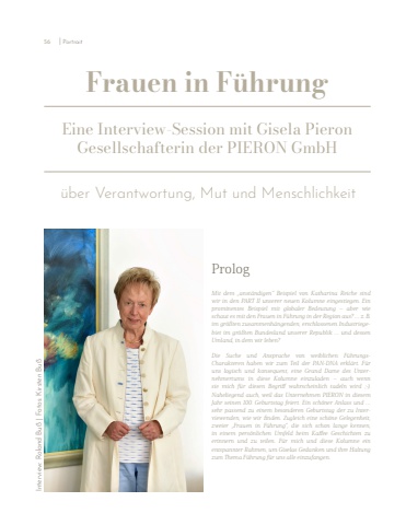 Frauen in F%u00fchrungPrologMit dem %u201eanst%u00e4ndigen%u201c Beispiel von Katharina Reiche sind wir in den PART II unserer neuen Kolumne eingestiegen. Ein prominentes Beispiel mit globaler Bedeutung %u2013 aber wie schaut es mit den Frauen in F%u00fchrung in der Region aus? %u2026 z. B. im gr%u00f6%u00dften zusammenh%u00e4ngenden, erschlossenen Industriegebiet im gr%u00f6%u00dften Bundesland unserer Republik %u2026 und dessen Umland, in dem wir leben?Die Suche und Ansprache von weiblichen F%u00fchrungsCharakteren haben wir zum Teil der PAN-DNA erkl%u00e4rt. F%u00fcr uns logisch und konsequent, eine Grand Dame des Unternehmertums in diese Kolumne einzuladen %u2013 auch wenn sie mich f%u00fcr diesen Begriff wahrscheinlich tadeln wird ;-). Naheliegend auch, weil das Unternehmen PIERON in diesem Jahr seinen 100. Geburtstag feiert. Ein sch%u00f6ner Anlass und %u2026 sehr passend zu einem besonderen Geburtstag der zu Interviewenden, wie wir finden. Zugleich eine sch%u00f6ne Gelegenheit, zweier %u201eFrauen in F%u00fchrung%u201c, die sich schon lange kennen, in einem pers%u00f6nlichen Umfeld beim Kaffee Geschichten zu erinnern und zu teilen. F%u00fcr mich und diese Kolumne ein entspannter Rahmen, um Giselas Gedanken und ihre Haltung zum Thema F%u00fchrung f%u00fcr uns alle einzufangen.%u00fcber Verantwortung, Mut und MenschlichkeitEine Interview-Session mit Gisela PieronGesellschafterin der PIERON GmbH56 I PortraitIntervie Roland Bu%u00df | Fotos: Kirsten Bu%u00df